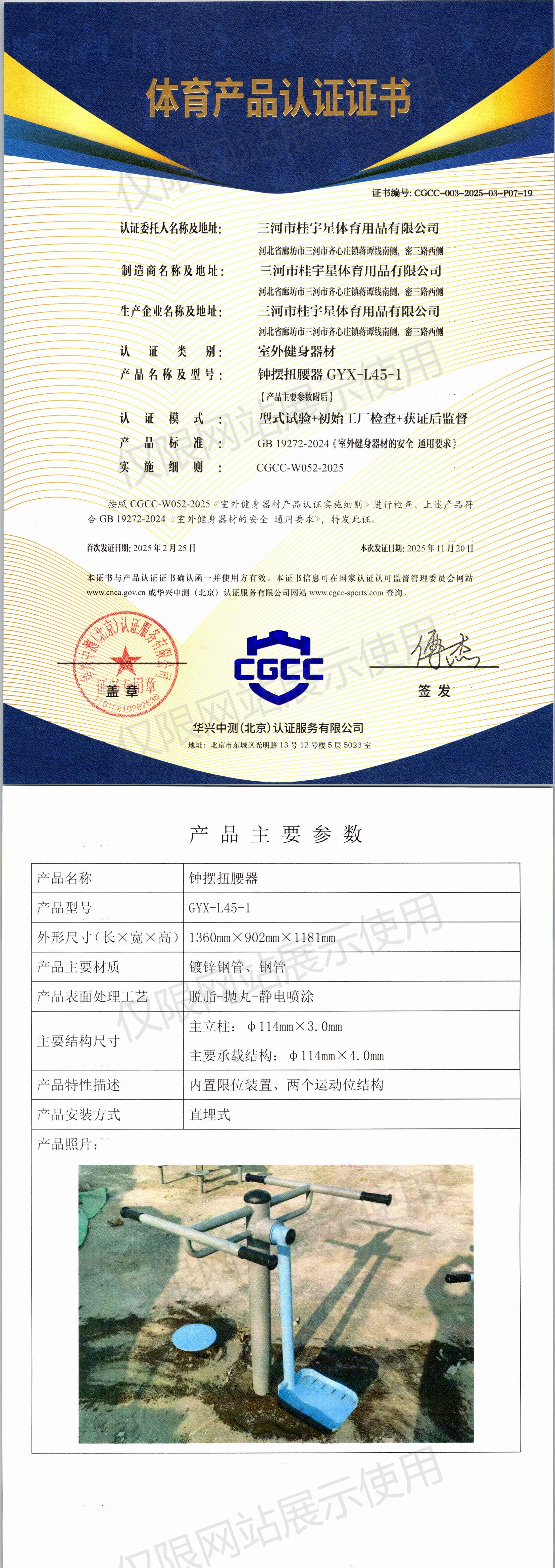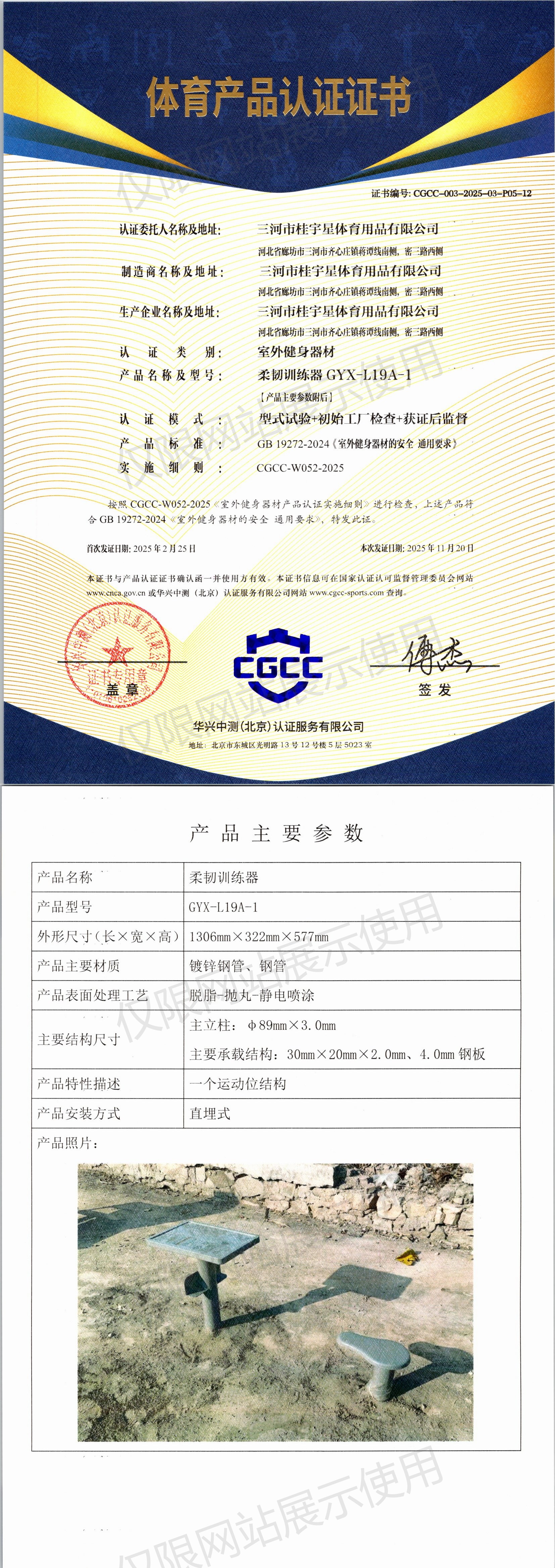 | 7 | 三河市桂宇星体育用品有限公司 | CGCC-003-2025-03-P05-12 | 柔韧训练器 | GYX-L19A-1 | 河北省廊坊市三河市齐心庄镇蒋谭线南侧,密三路西侧 | GB 19272-2024 | 2025-02-25 | 有效 | 查看 |