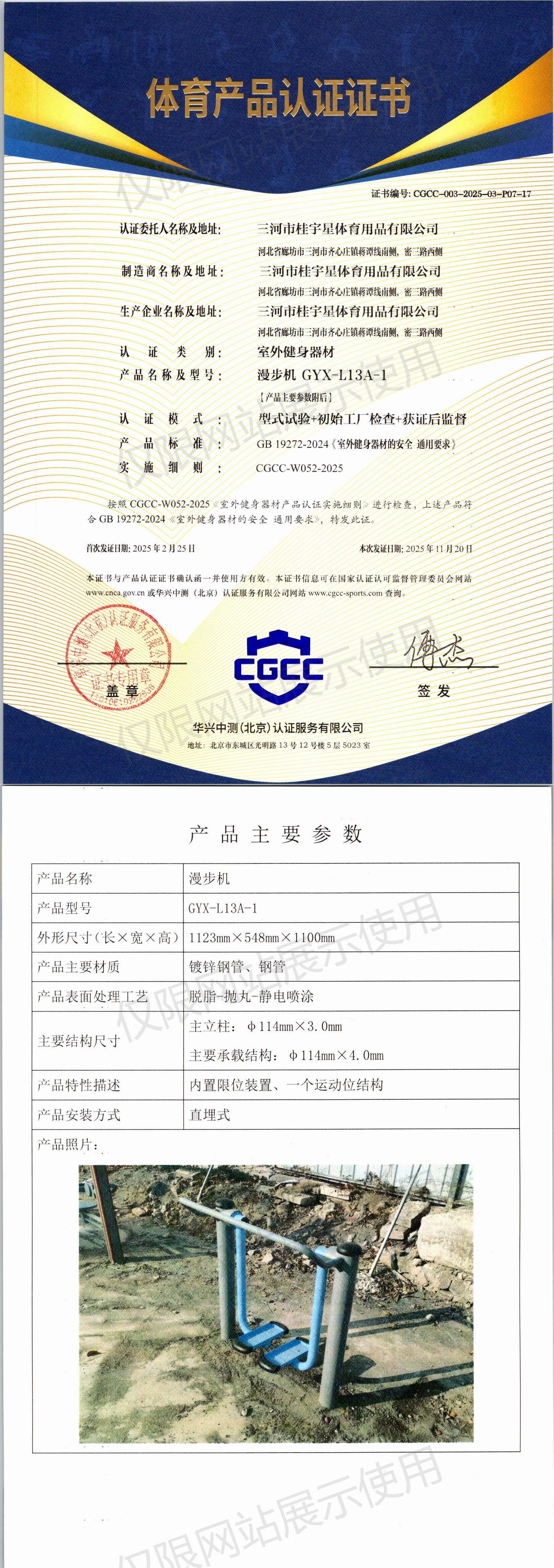 | 8 | 三河市桂宇星体育用品有限公司 | CGCC-003-2025-03-P07-17 | 漫步机 | GYX-L13A-1 | 河北省廊坊市三河市齐心庄镇蒋谭线南侧,密三路西侧 | GB 19272-2024 | 2025-02-25 | 有效 | 查看 |