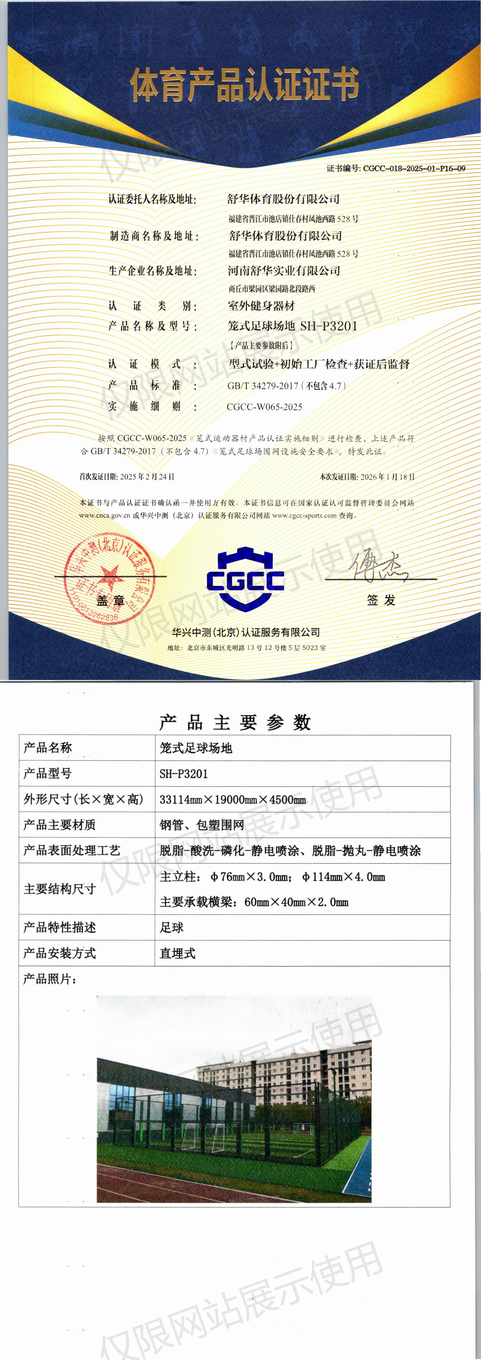 | 3 | 舒华体育股份有限公司 | CGCC-018-2025-01-P16-08 | 笼式足球场地 | JLG-300Z | 商丘市梁园区梁园路北段路西 | GB19272-2011、GB/T19851.15-2007 足球竞赛规则 | 2025-02-24 | 有效 | 查看 |