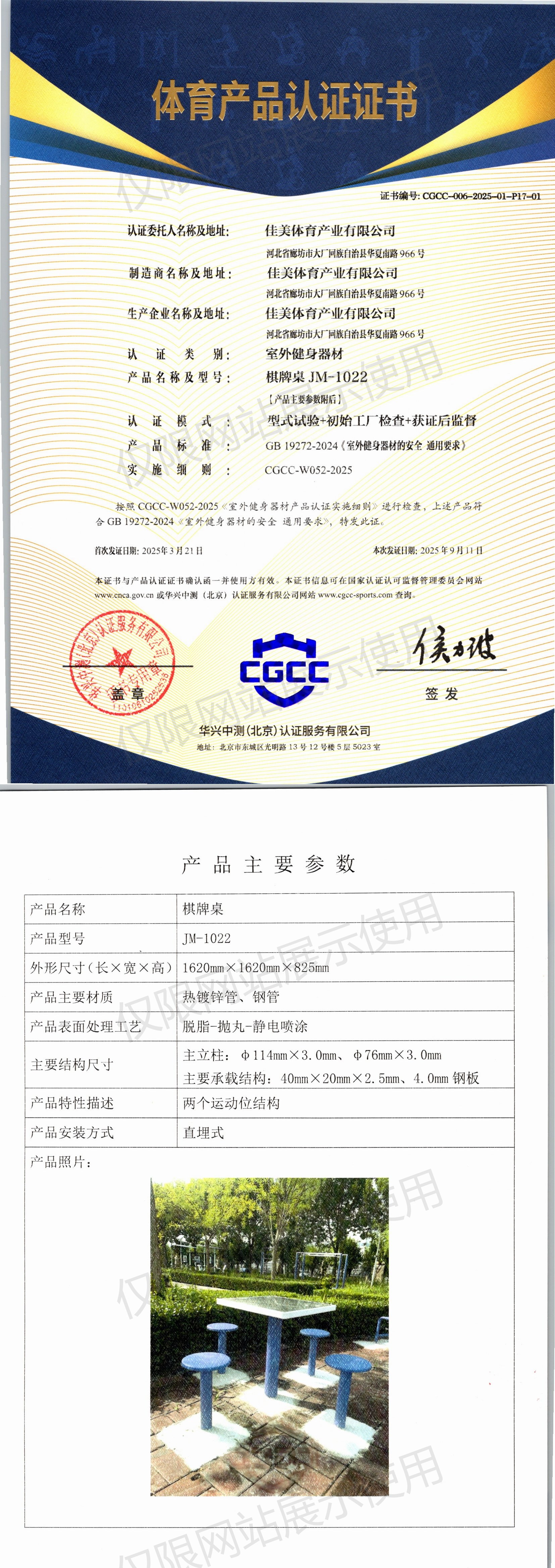 | 8 | 佳美体育产业有限公司 | CGCC-006-2025-01-P17-01 | 棋牌桌 | JM-1022 | 河北省廊坊市大厂回族自治县华夏南路966号 | GB 19272-2024 | 2025-03-21 | 有效 | 查看 |