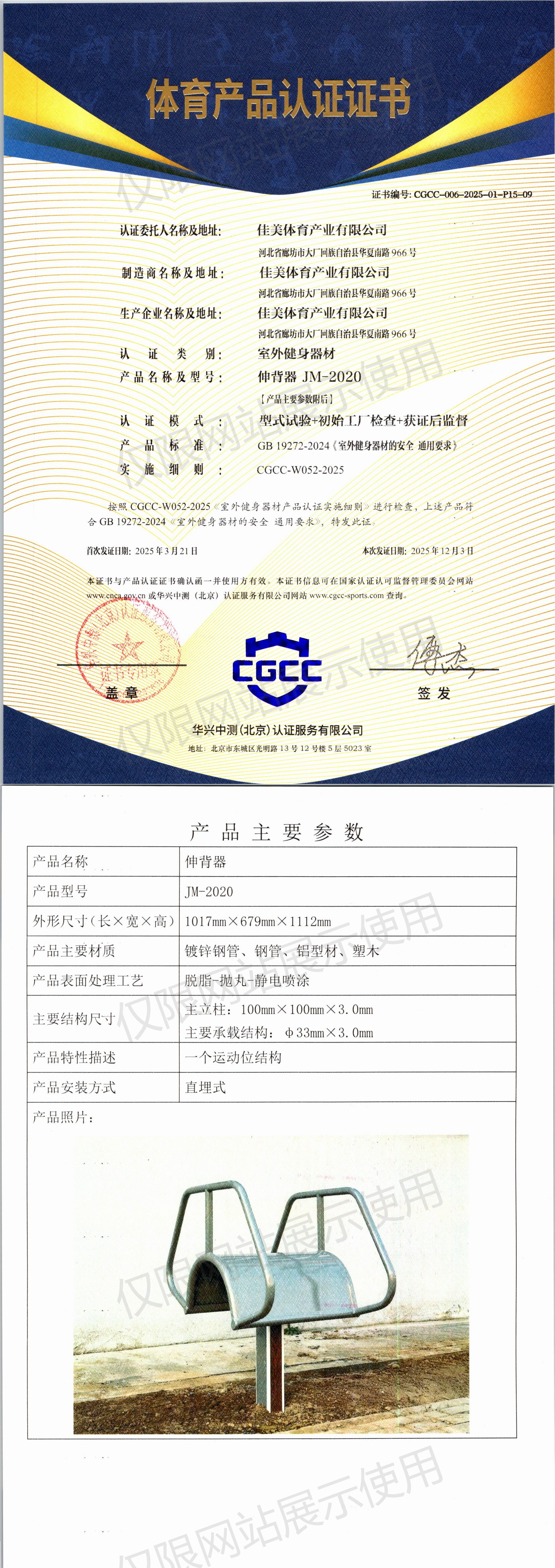 | 2 | 佳美体育产业有限公司 | CGCC-006-2025-01-P15-09 | 伸背器 | JM-2020 | 河北省廊坊市大厂回族自治县华夏南路966号 | GB 19272-2024 | 2025-03-21 | 有效 | 查看 |