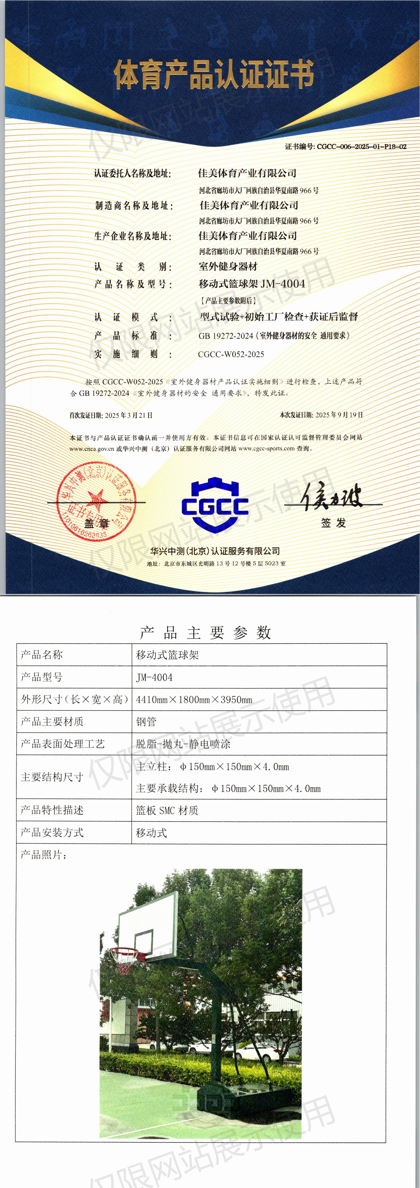 | 7 | 佳美体育产业有限公司 | CGCC-006-2025-01-P18-02 | 移动式篮球架 | JM-4004 | 河北省廊坊市大厂回族自治县华夏南路966号 | GB 19272-2024 | 2025-03-21 | 有效 | 查看 |