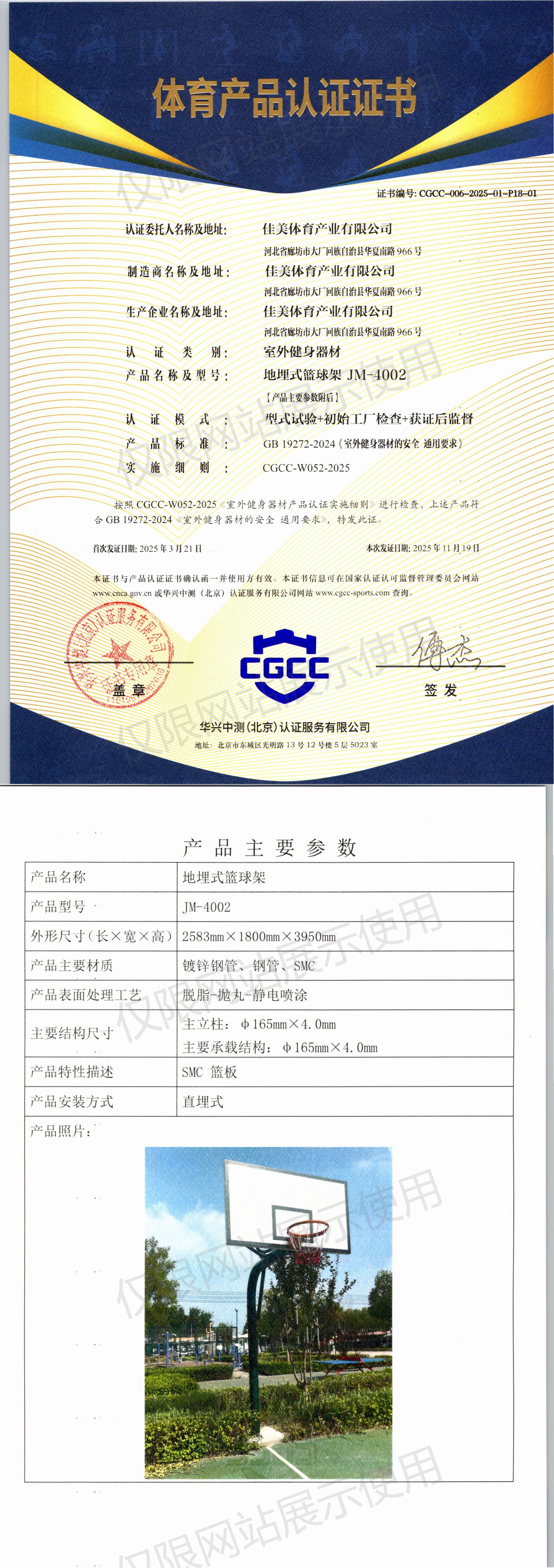 | 6 | 佳美体育产业有限公司 | CGCC-006-2025-01-P18-01 | 地埋式篮球架 | JM-4002 | 河北省廊坊市大厂回族自治县华夏南路966号 | GB 19272-2024 | 2025-03-21 | 有效 | 查看 |