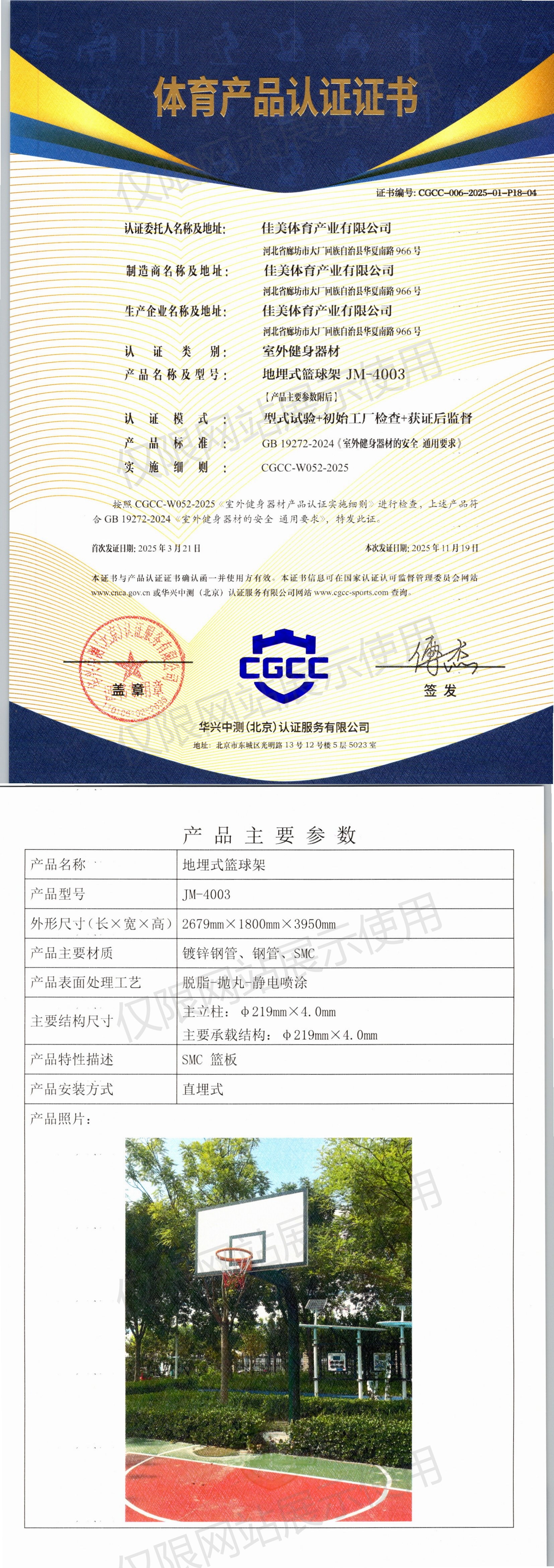 | 9 | 佳美体育产业有限公司 | CGCC-006-2025-01-P18-04 | 地埋式篮球架 | JM-4003 | 河北省廊坊市大厂回族自治县华夏南路966号 | GB 19272-2024 | 2025-03-21 | 有效 | 查看 |