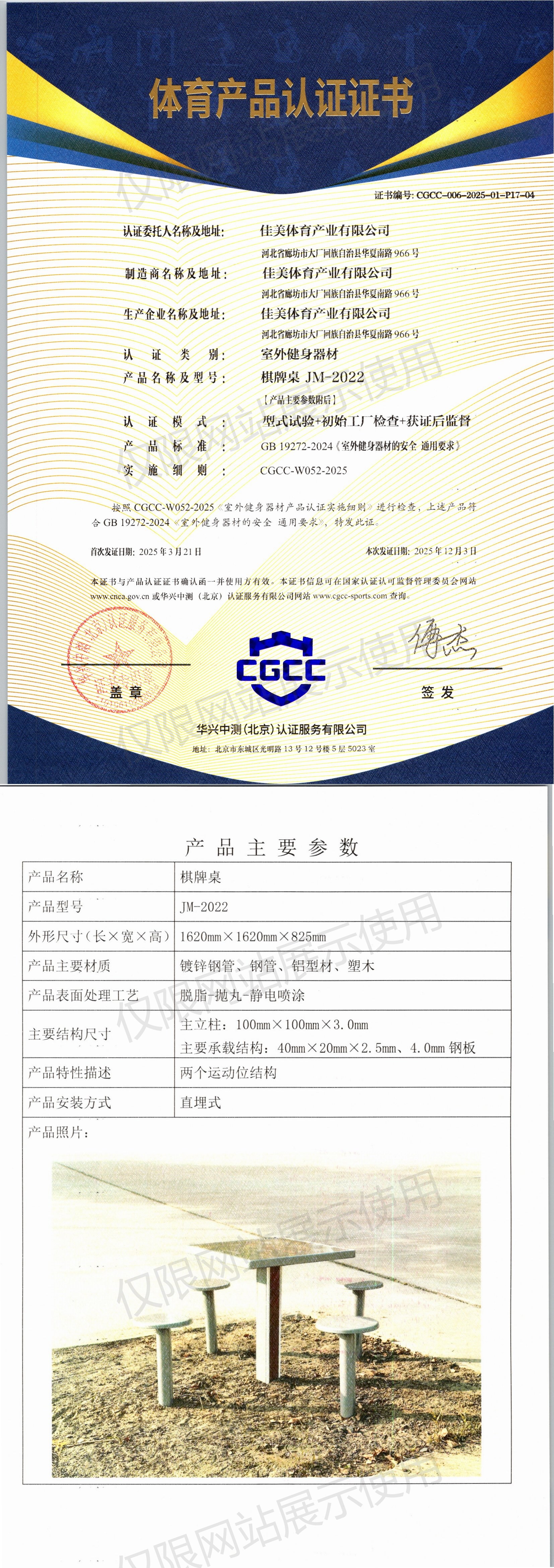 | 2 | 佳美体育产业有限公司 | CGCC-006-2025-01-P17-05 | 室外轨道式中国象棋 | JMD-010 | 河北省廊坊市大厂回族自治县华夏南路966号 | GB 19272-2011 | 2025-03-21 | 有效 | 查看 |