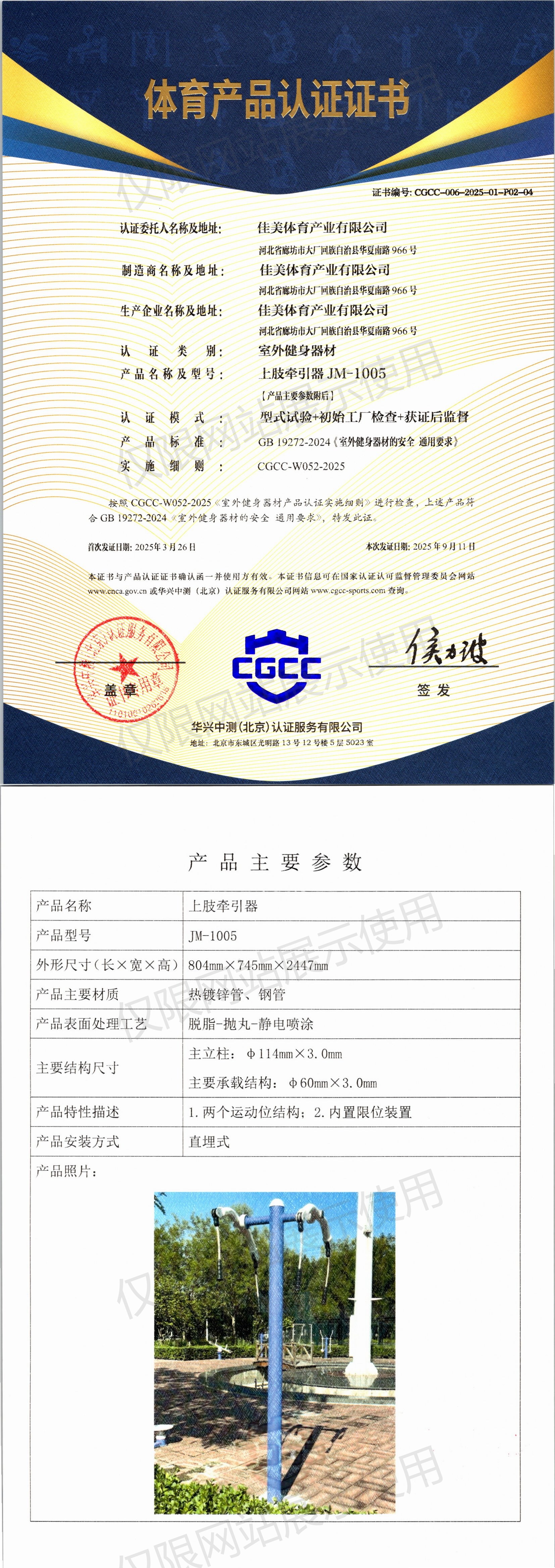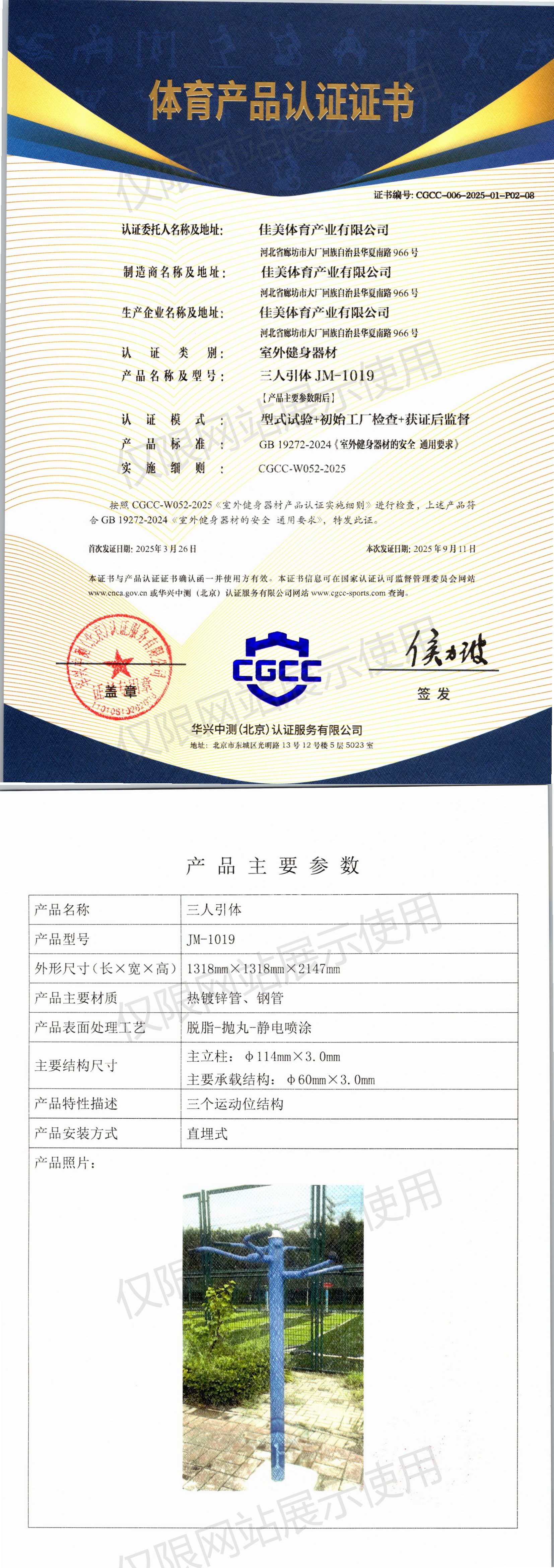 | 9 | 佳美体育产业有限公司 | CGCC-006-2025-01-P02-08 | 三人引体 | JM-1019 | 河北省廊坊市大厂回族自治县华夏南路966号 | GB 19272-2024 | 2025-03-26 | 有效 | 查看 |