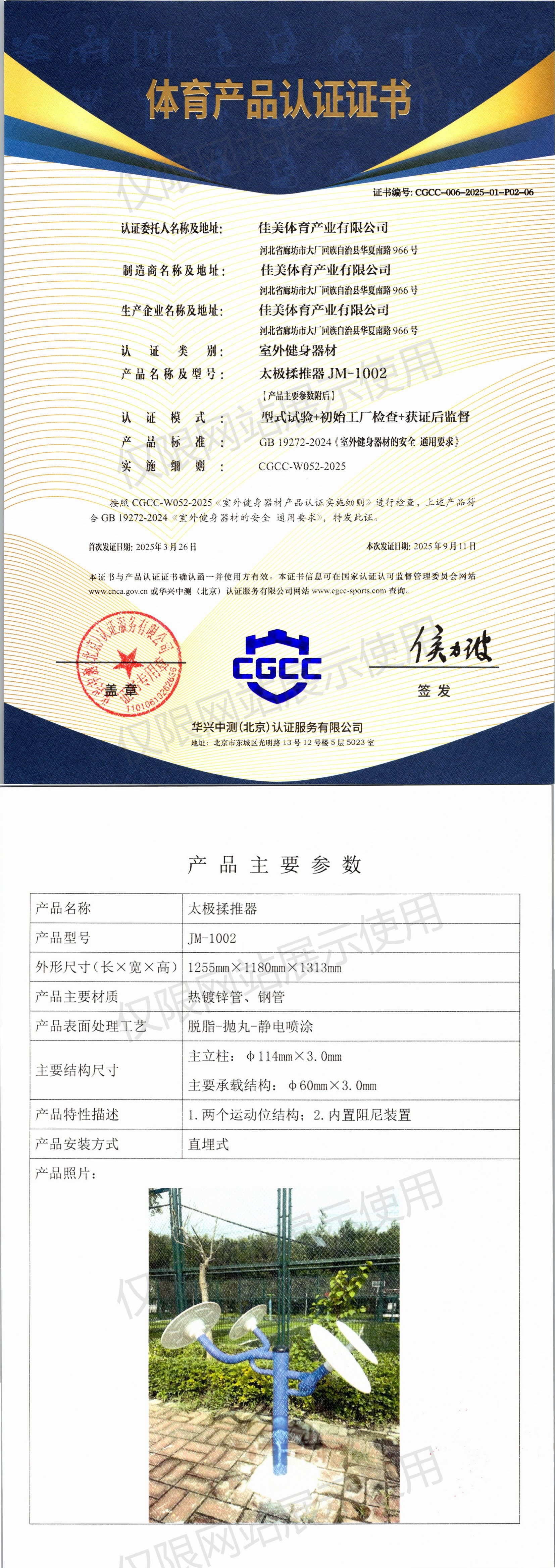 | 7 | 佳美体育产业有限公司 | CGCC-006-2025-01-P02-06 | 太极揉推器 | JM-1002 | 河北省廊坊市大厂回族自治县华夏南路966号 | GB 19272-2024 | 2025-03-26 | 有效 | 查看 |