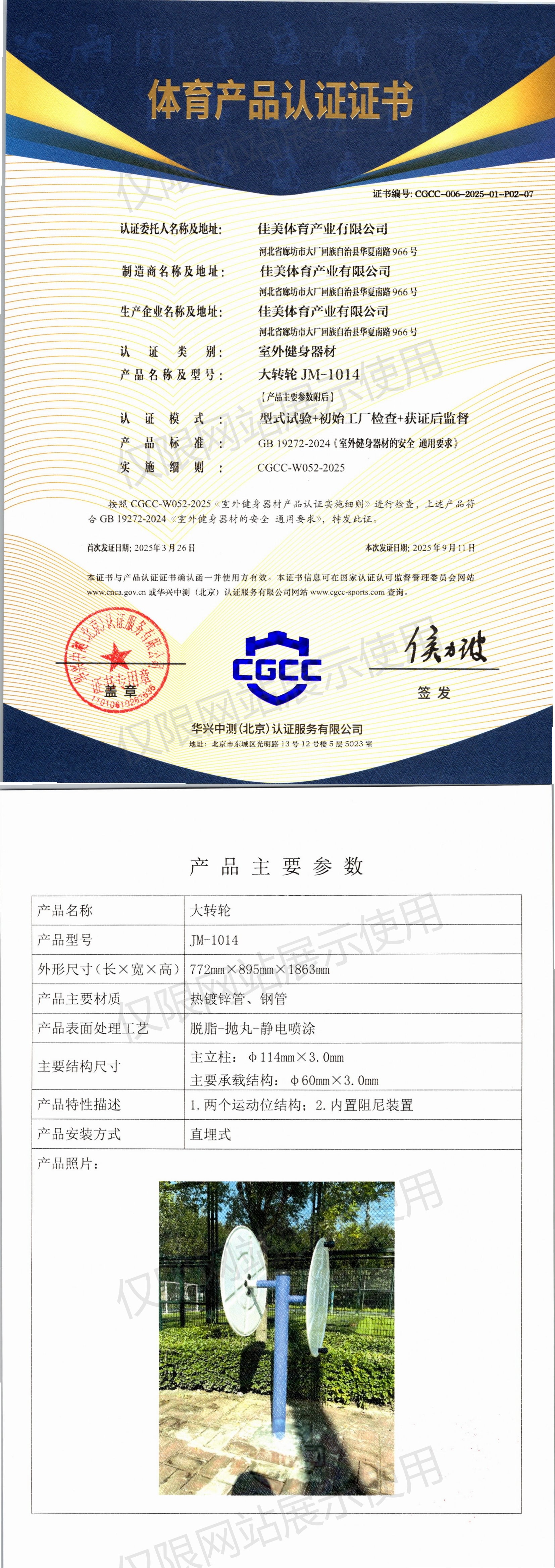 | 8 | 佳美体育产业有限公司 | CGCC-006-2025-01-P02-07 | 大转轮 | JM-1014 | 河北省廊坊市大厂回族自治县华夏南路966号 | GB 19272-2024 | 2025-03-26 | 有效 | 查看 |
