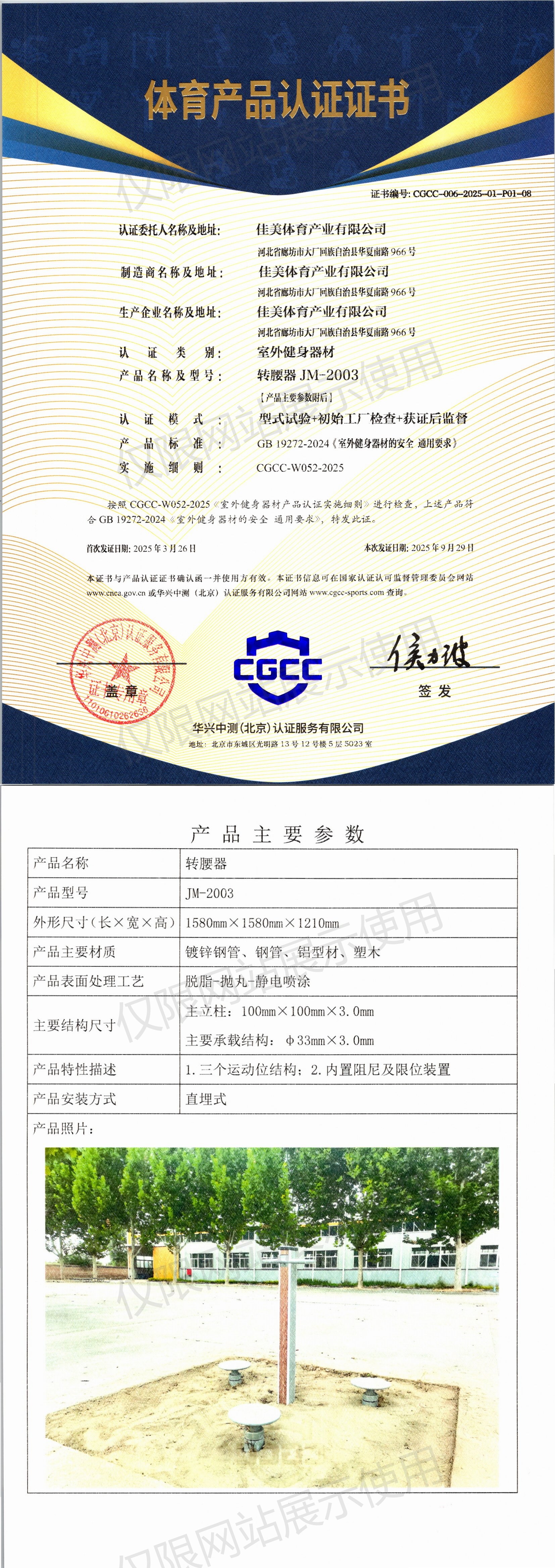 | 3 | 佳美体育产业有限公司 | CGCC-006-2025-01-P01-08 | 转腰器 | JM-2003 | 河北省廊坊市大厂回族自治县华夏南路966号 | GB 19272-2024 | 2025-03-26 | 有效 | 查看 |