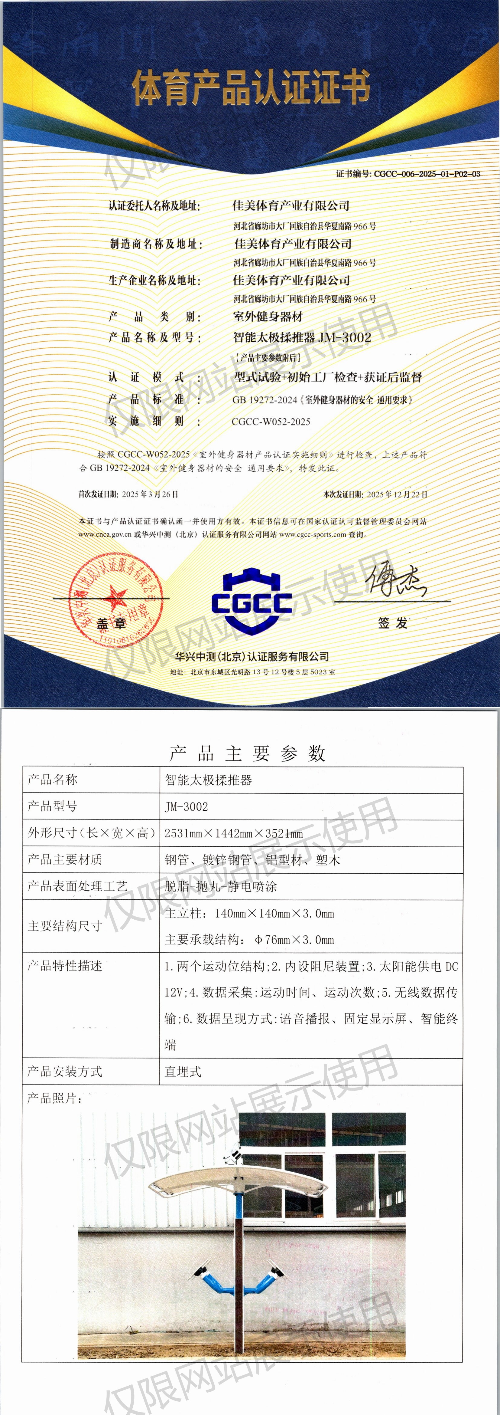 | 4 | 佳美体育产业有限公司 | CGCC-006-2025-01-P02-03 | 智能太极揉推器 | JM-3002 | 河北省廊坊市大厂回族自治县华夏南路966号 | GB 19272-2024 | 2025-03-26 | 有效 | 查看 |