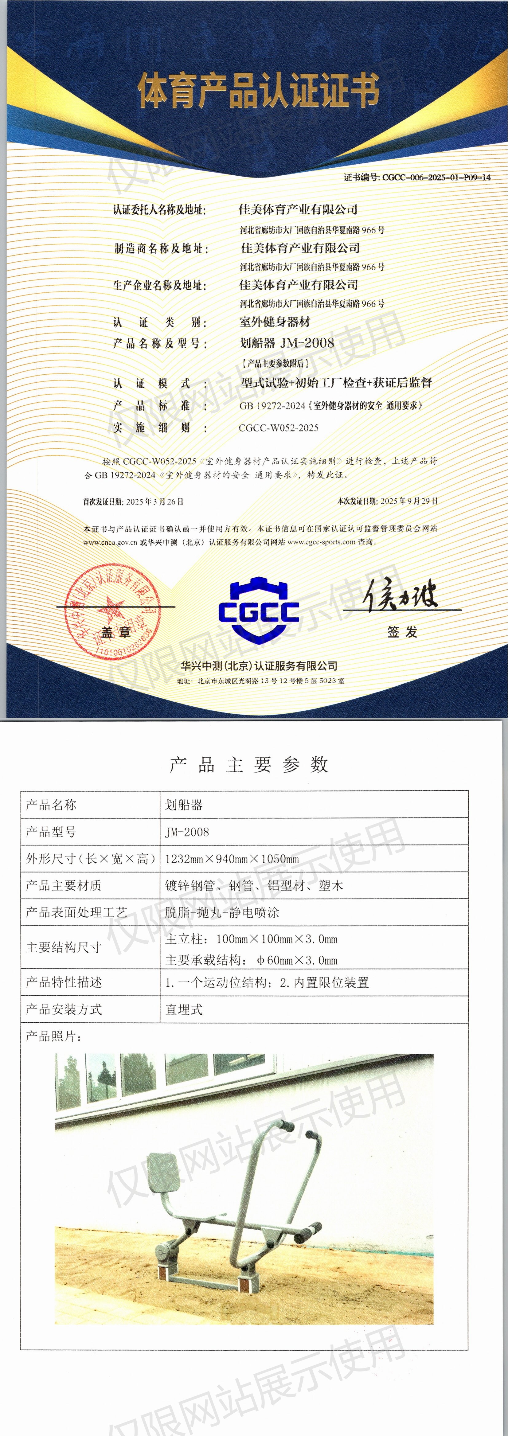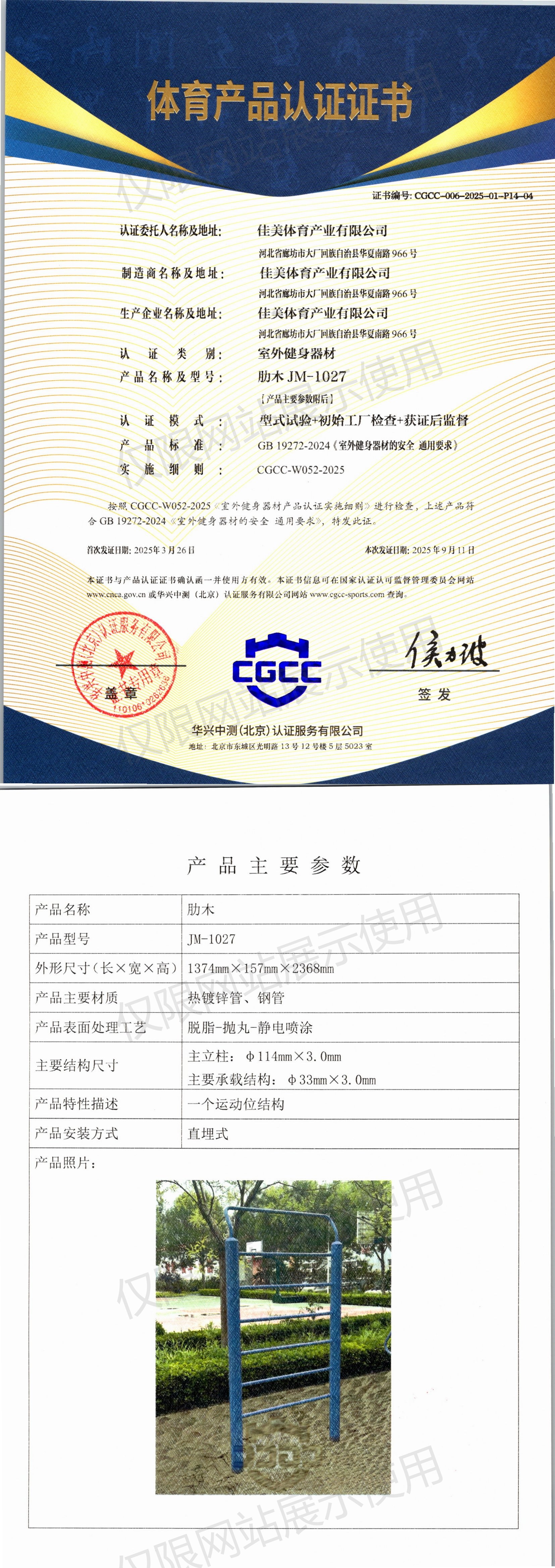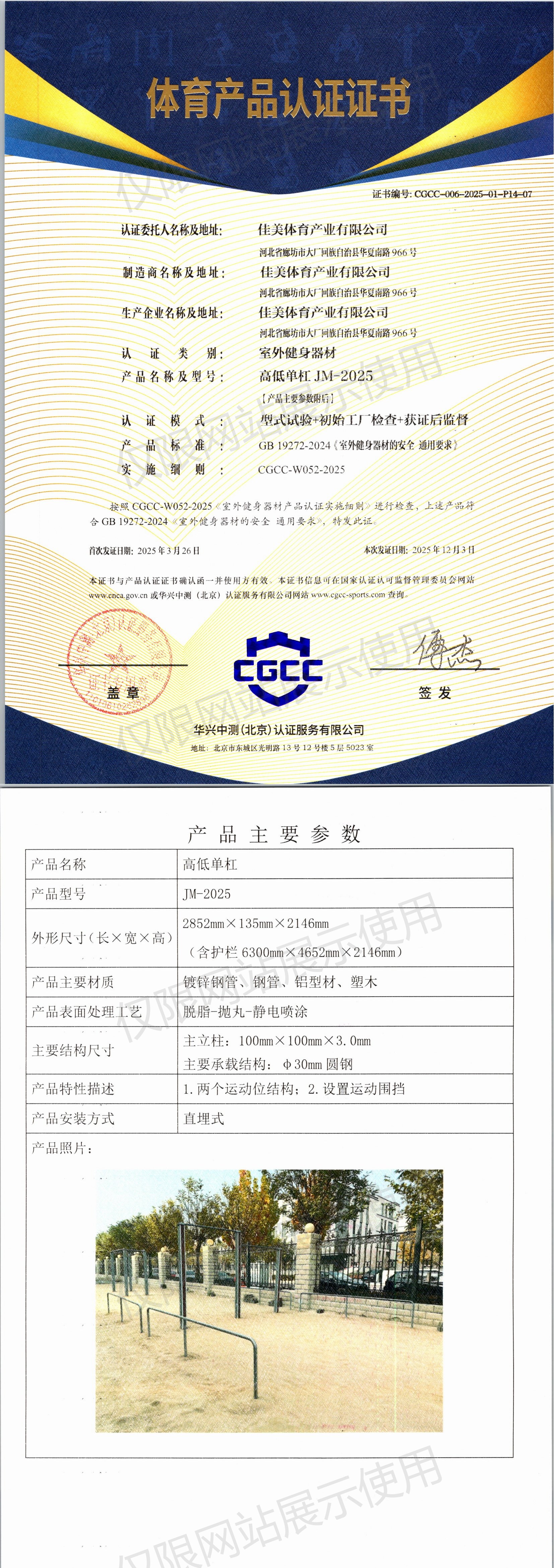 | 2 | 佳美体育产业有限公司 | CGCC-006-2025-01-P14-02 | 双杠 | JM-1024 | 河北省廊坊市大厂回族自治县华夏南路966号 | GB 19272-2024 | 2025-03-26 | 有效 | 查看 |