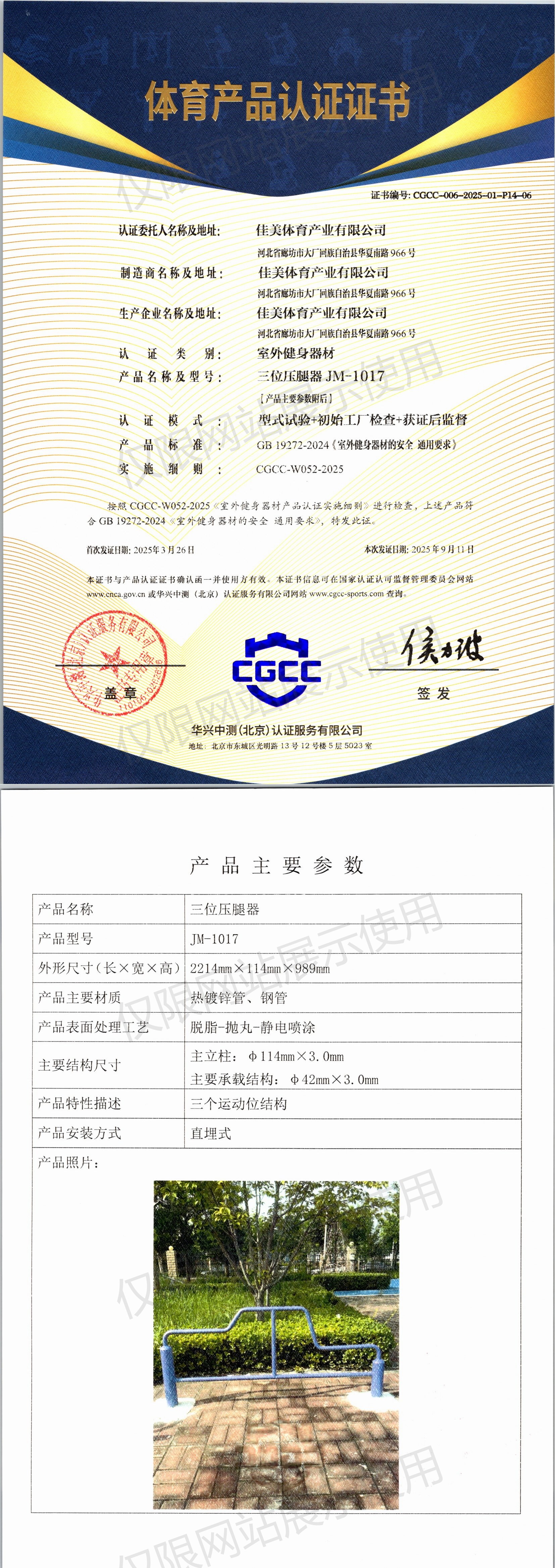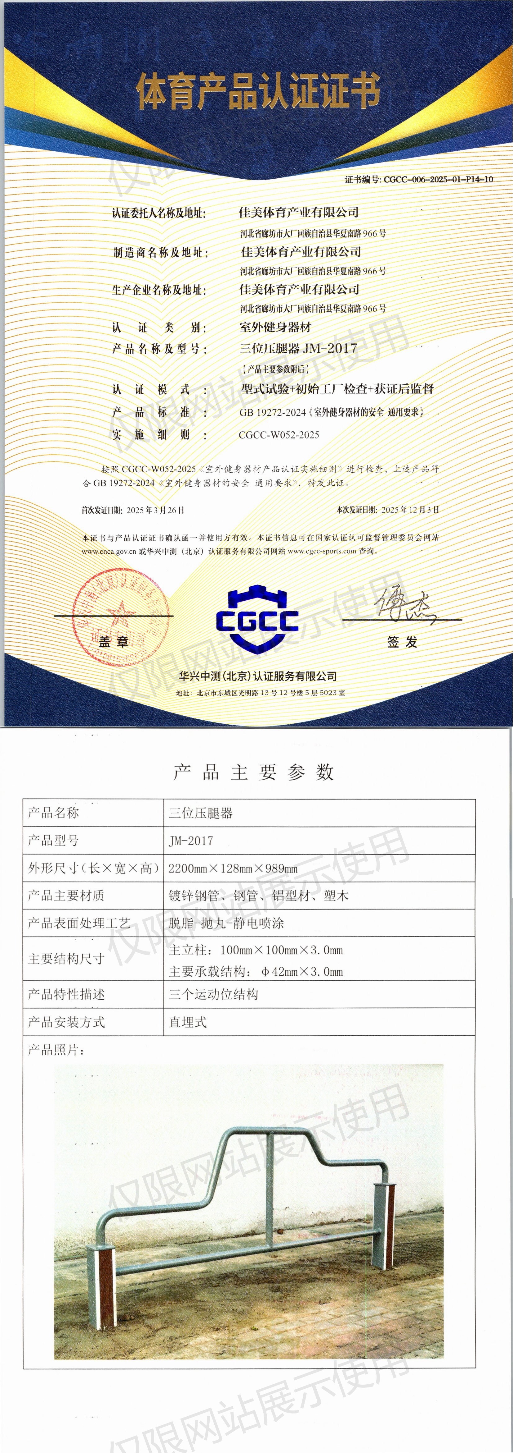 | 6 | 佳美体育产业有限公司 | CGCC-006-2025-01-P14-06 | 三位压腿器 | JM-1017 | 河北省廊坊市大厂回族自治县华夏南路966号 | GB 19272-2024 | 2025-03-26 | 有效 | 查看 |