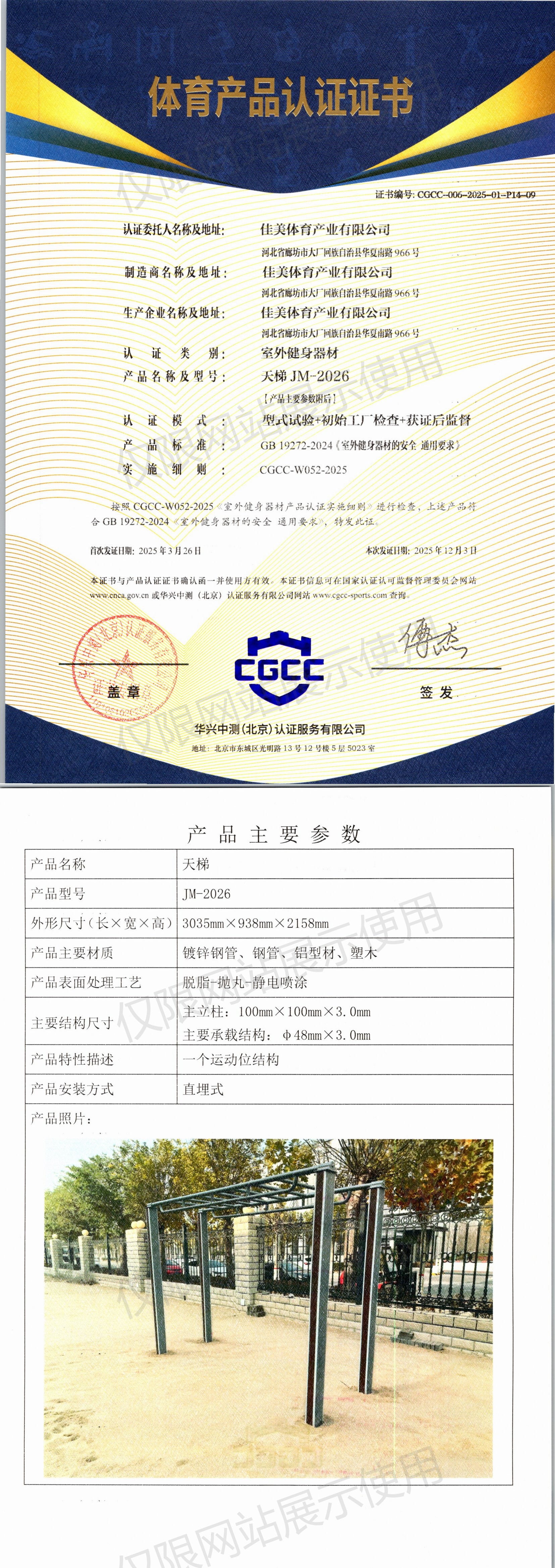 | 9 | 佳美体育产业有限公司 | CGCC-006-2025-01-P14-09 | 天梯 | JM-2026 | 河北省廊坊市大厂回族自治县华夏南路966号 | GB 19272-2024 | 2025-03-26 | 有效 | 查看 |