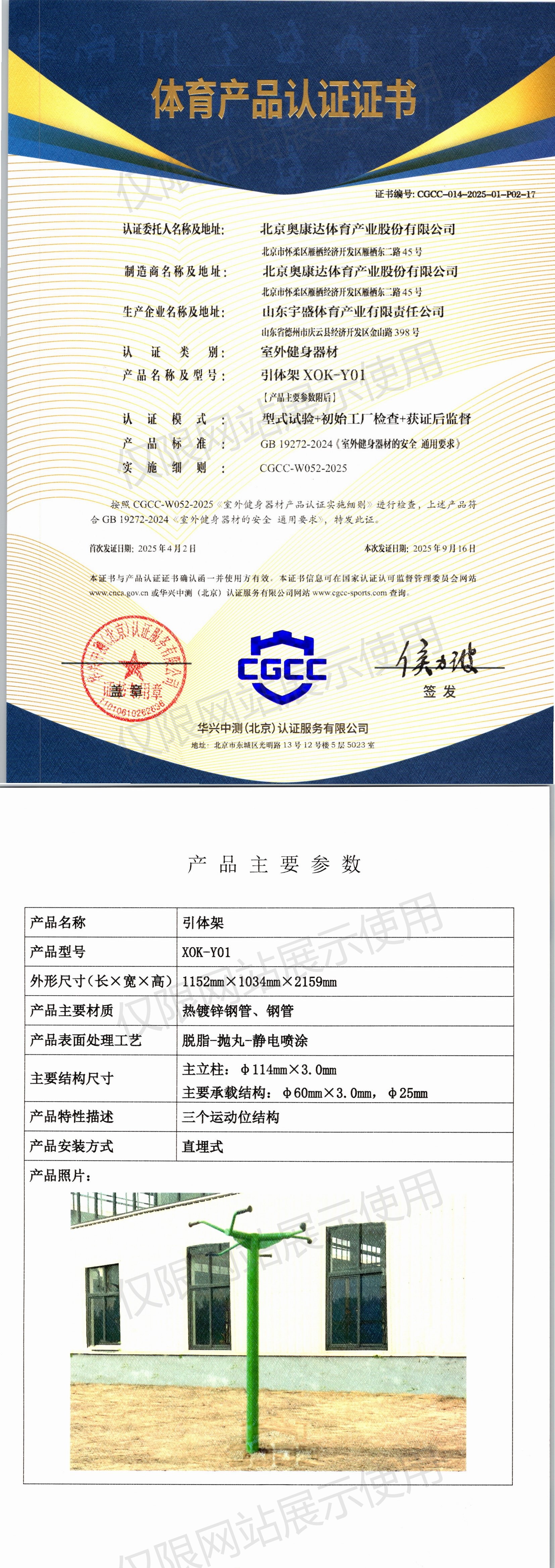 | 4 | 北京奥康达体育产业股份有限公司 | CGCC-014-2025-01-P02-17 | 引体架 | XOK-Y01 | 山东省德州市庆云县经济开发区金山路398号 | GB 19272-2024 | 2025-04-02 | 有效 | 查看 |