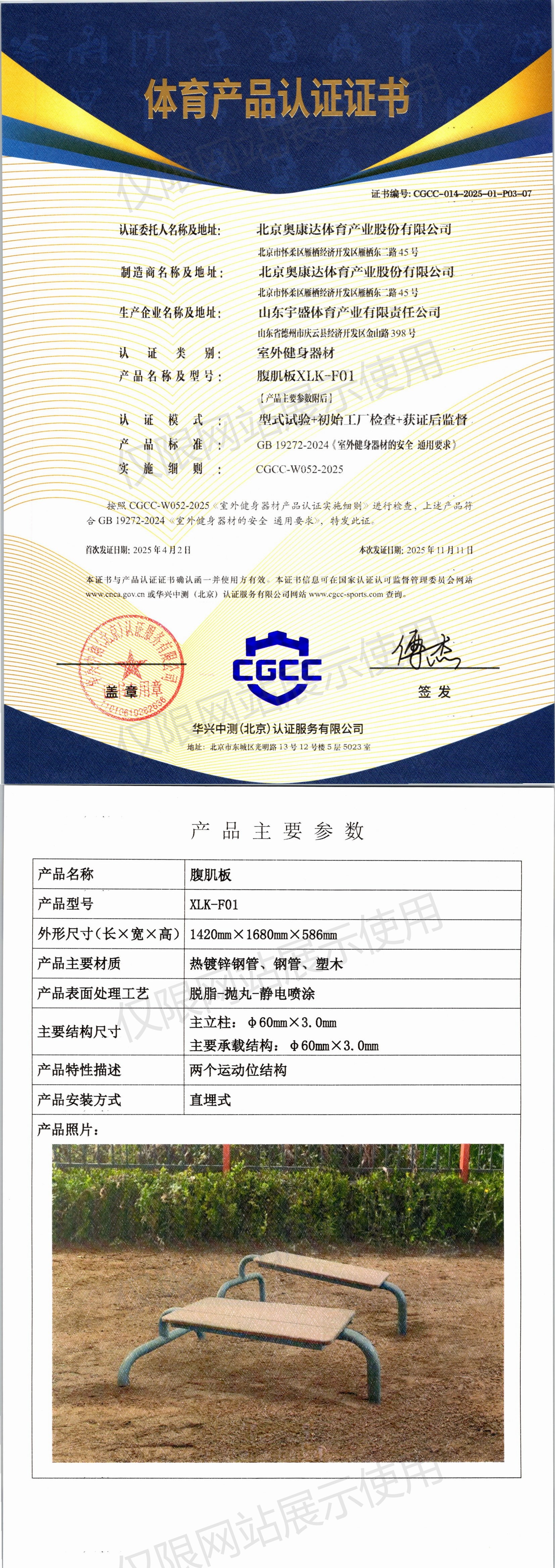 | 5 | 北京奥康达体育产业股份有限公司 | CGCC-014-2025-01-P03-02 | 腹肌板 | XOK-F01 | 山东省德州市庆云县经济开发区金山路398号 | GB 19272-2024 | 2025-04-02 | 有效 | 查看 |