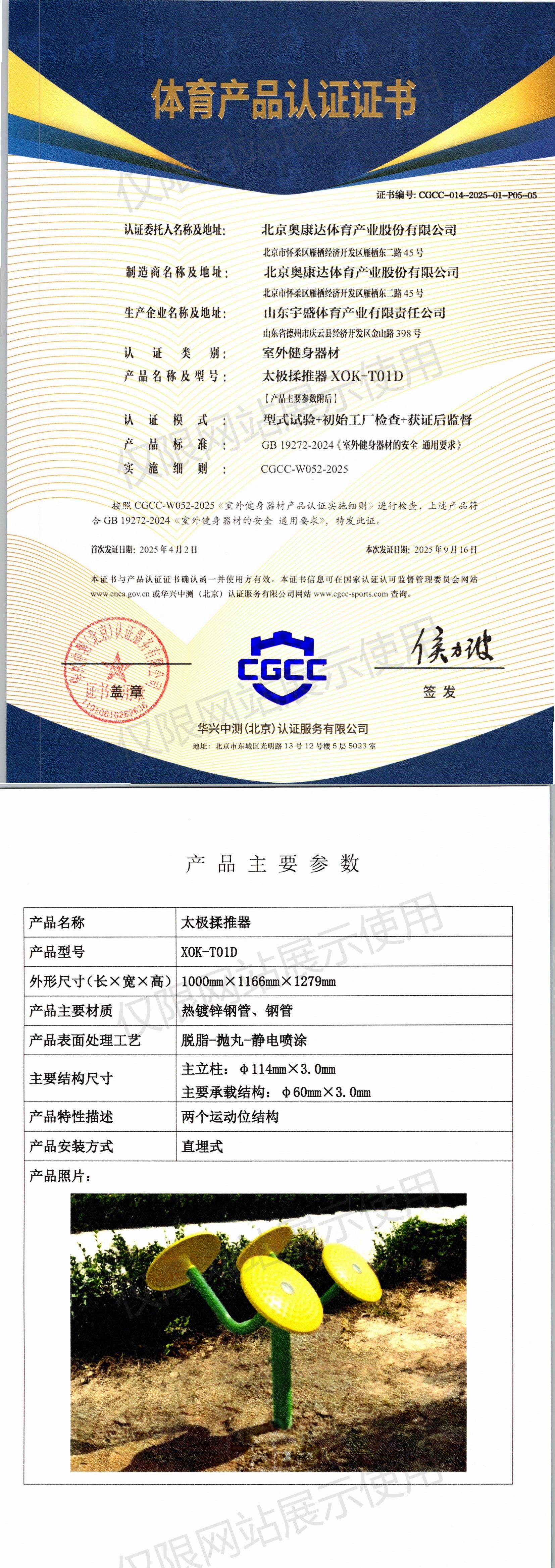| 1 | 北京奥康达体育产业股份有限公司 | CGCC-014-2025-01-P05-05 | 太极揉推器 | XOK-T01D | 山东省德州市庆云县经济开发区金山路398号 | GB 19272-2024 | 2025-04-02 | 有效 | 查看 |