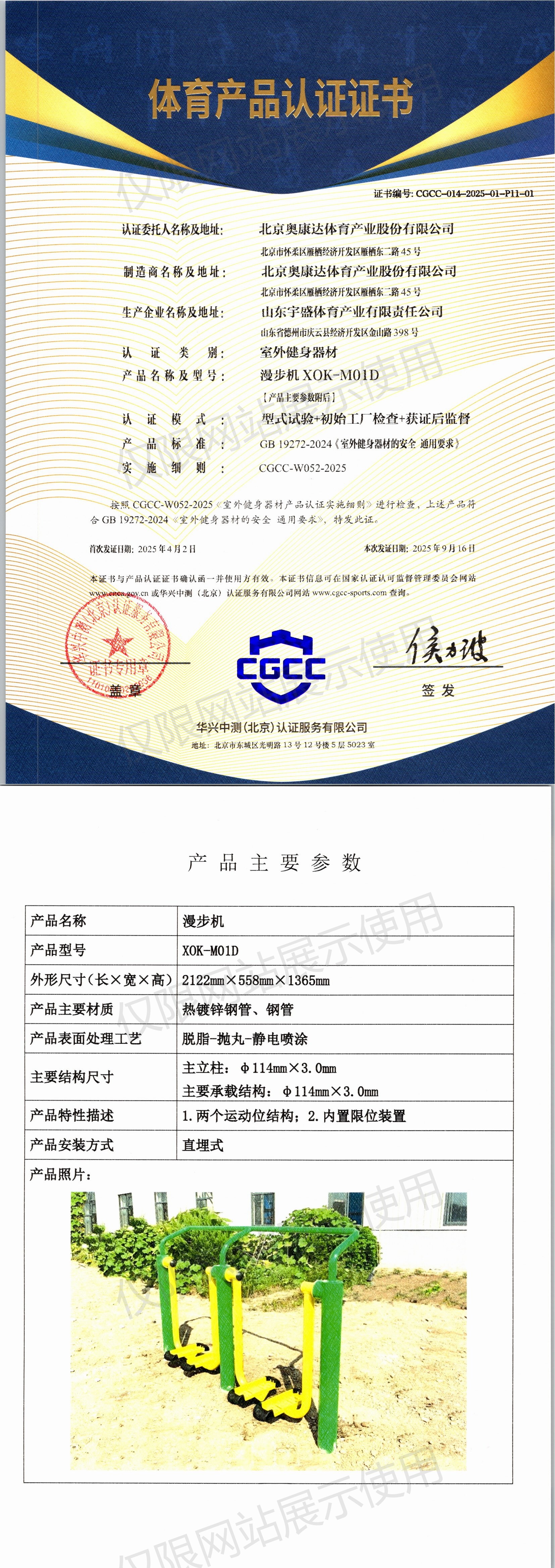 | 8 | 北京奥康达体育产业股份有限公司 | CGCC-014-2025-01-P11-01 | 漫步机 | XOK-M01D | 山东省德州市庆云县经济开发区金山路398号 | GB 19272-2024 | 2025-04-02 | 有效 | 查看 |