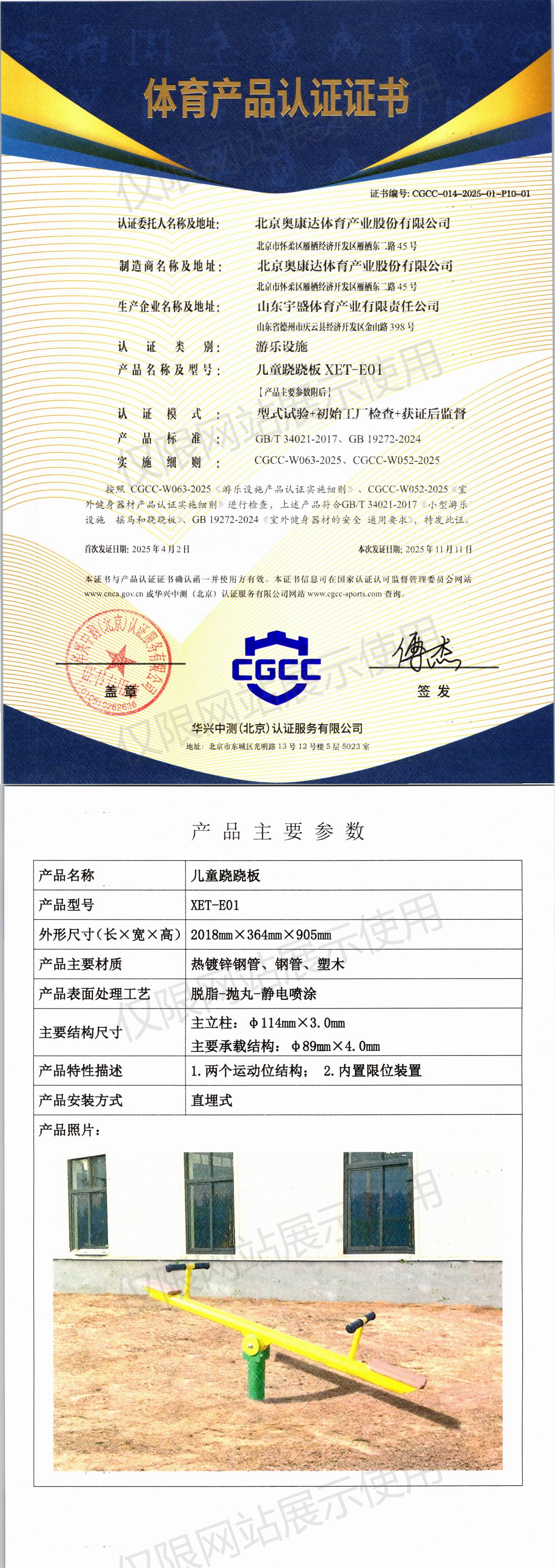 | 4 | 北京奥康达体育产业股份有限公司 | CGCC-014-2025-01-P10-01 | 儿童跷跷板 | XET-E01 | 山东省德州市庆云县经济开发区金山路398号 | GB/T 34021-2017、GB 19272-2024 | 2025-04-02 | 有效 | 查看 |