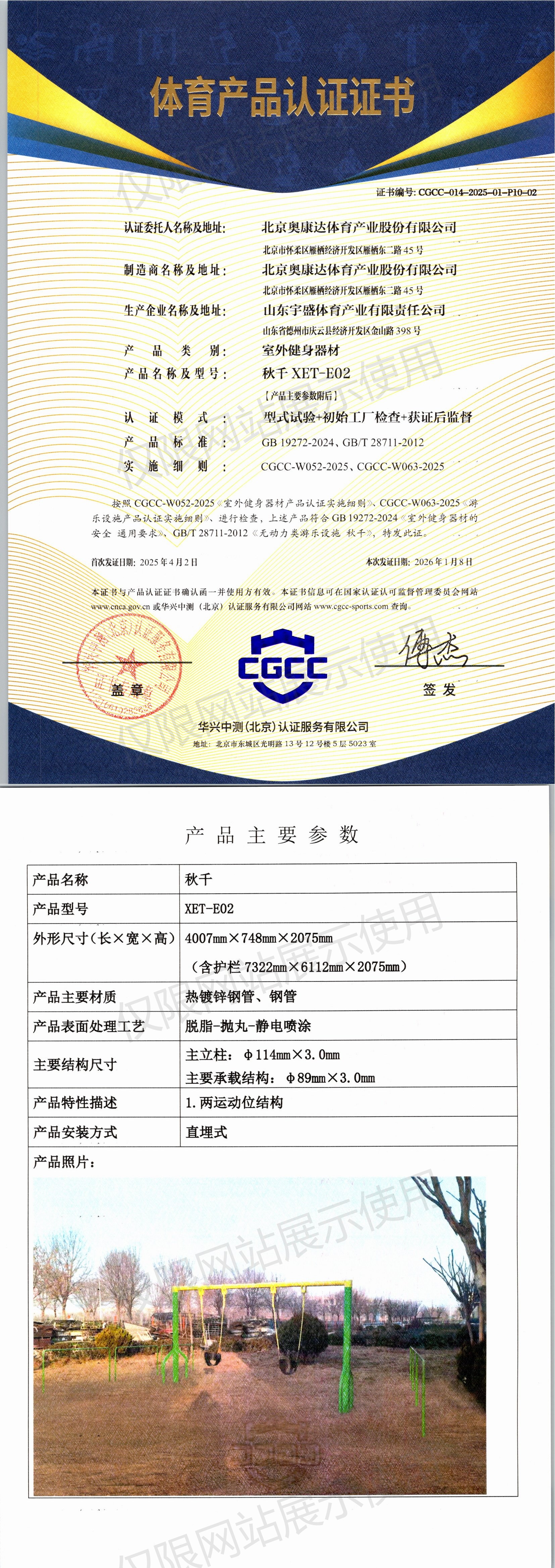 | 5 | 北京奥康达体育产业股份有限公司 | CGCC-014-2025-01-P10-02 | 秋千 | XET-E02 | 山东省德州市庆云县经济开发区金山路398号 | GB 19272-2024、GB/T 28711-2012 | 2025-04-02 | 有效 | 查看 |
