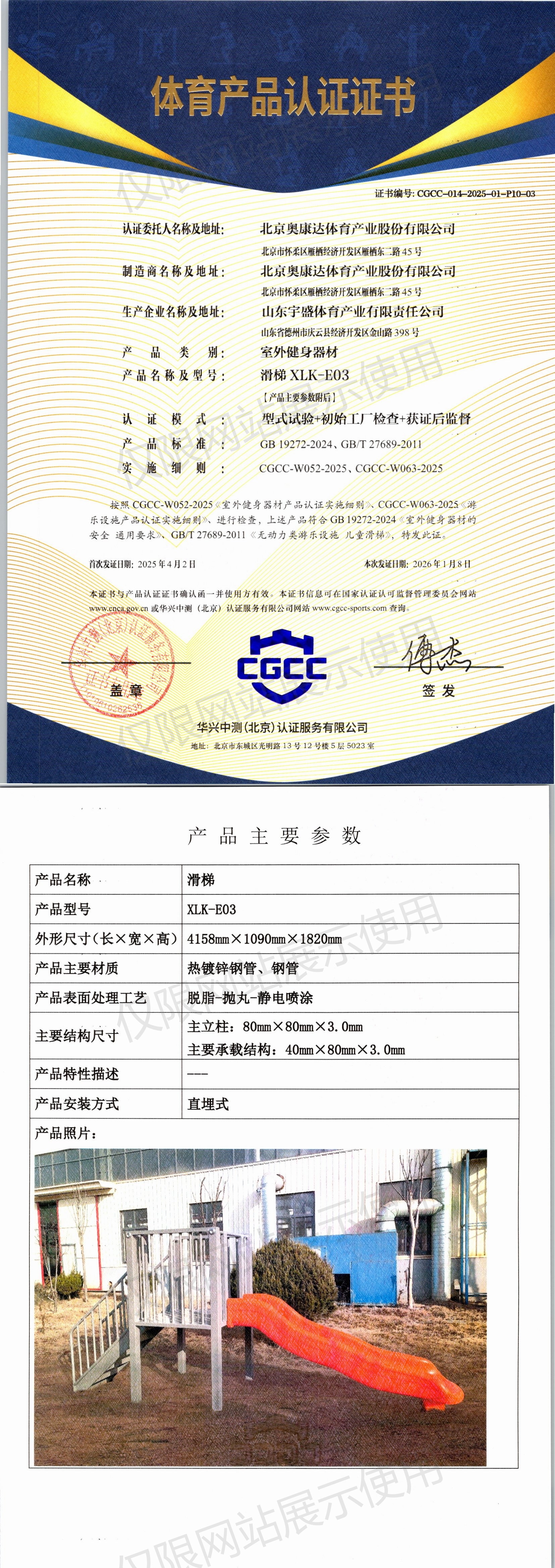 | 6 | 北京奥康达体育产业股份有限公司 | CGCC-014-2025-01-P10-03 | 滑梯 | XLK-E03 | 山东省德州市庆云县经济开发区金山路398号 | GB 19272-2024、GB/T 27689-2011 | 2025-04-02 | 有效 | 查看 |