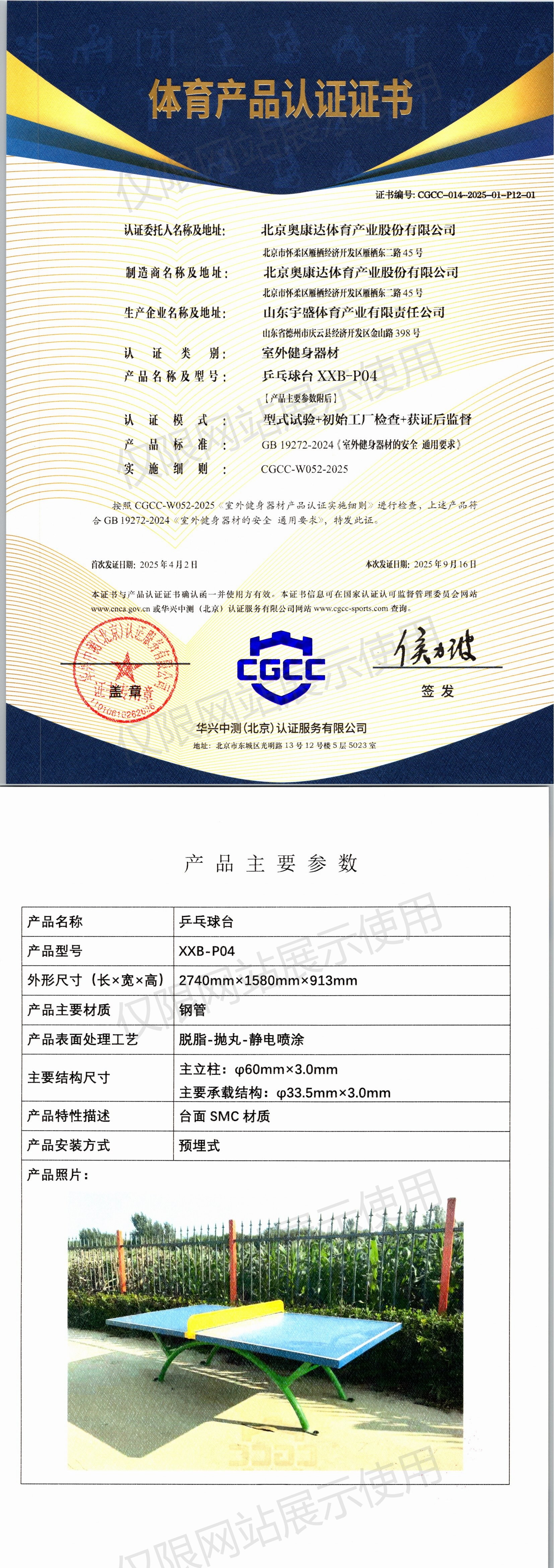 | 8 | 北京奥康达体育产业股份有限公司 | CGCC-014-2025-01-P12-01 | 乒乓球台 | XXB-P04 | 山东省德州市庆云县经济开发区金山路398号 | GB 19272-2024 | 2025-04-02 | 有效 | 查看 |