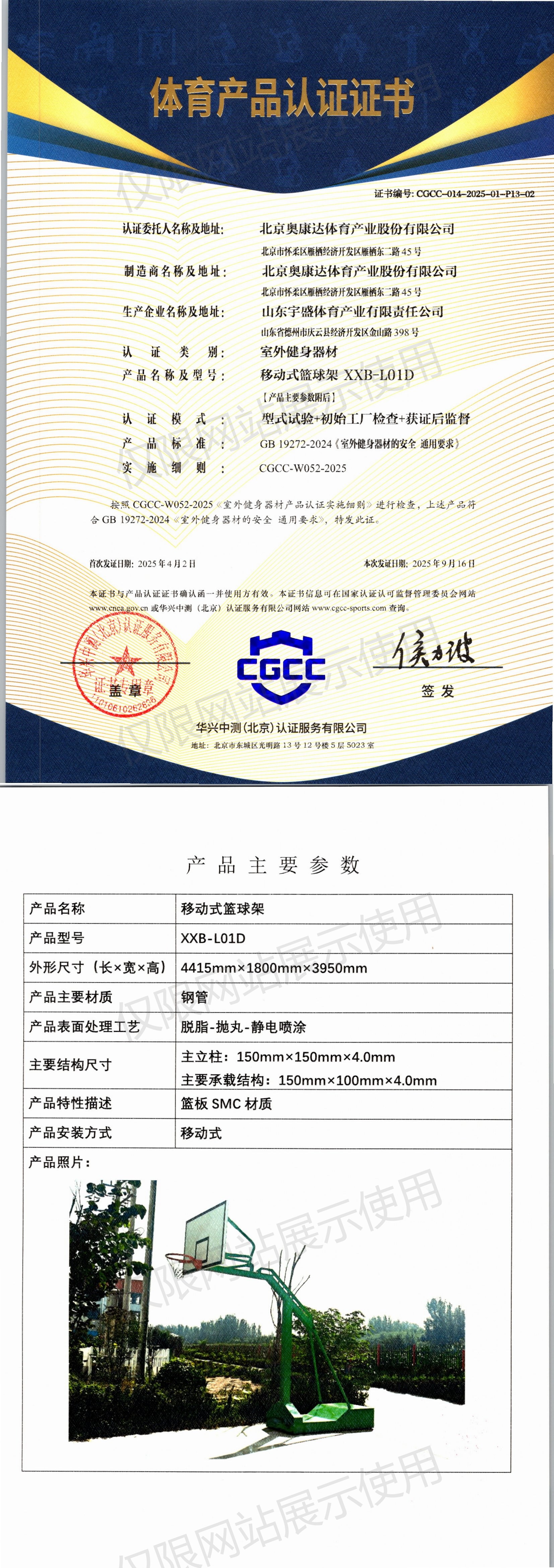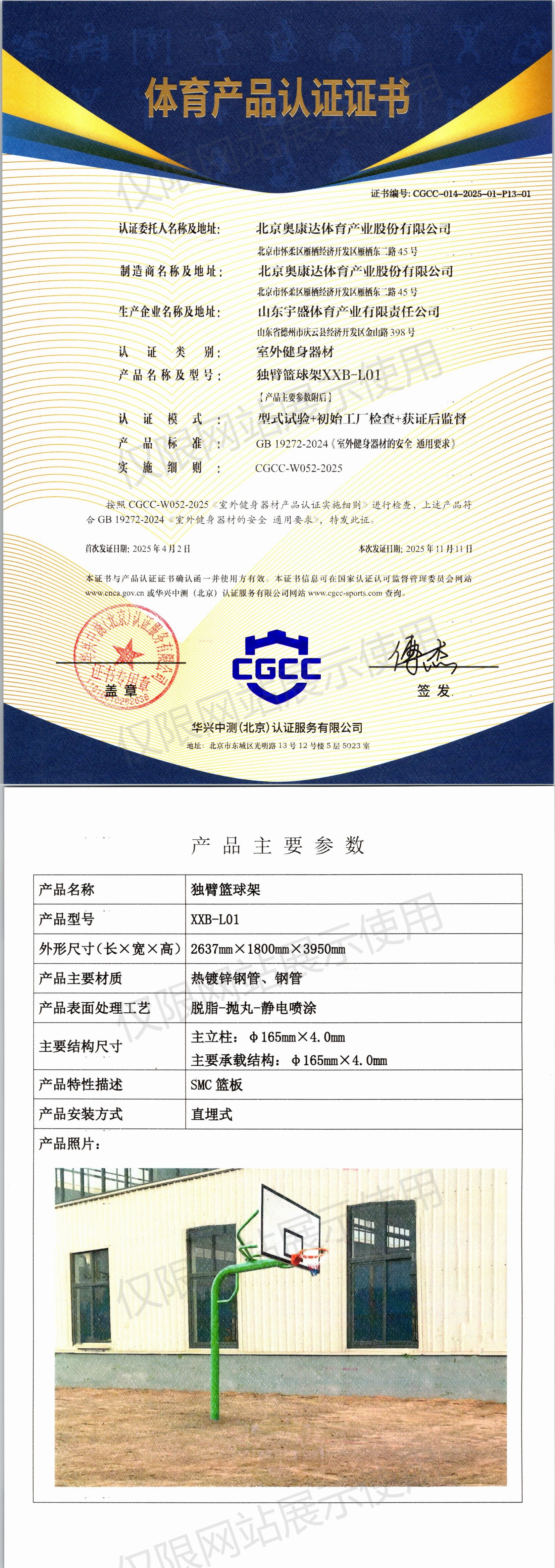 | 9 | 北京奥康达体育产业股份有限公司 | CGCC-014-2025-01-P13-01 | 独臂篮球架 | XXB-L01 | 山东省德州市庆云县经济开发区金山路398号 | GB 19272-2024 | 2025-04-02 | 有效 | 查看 |