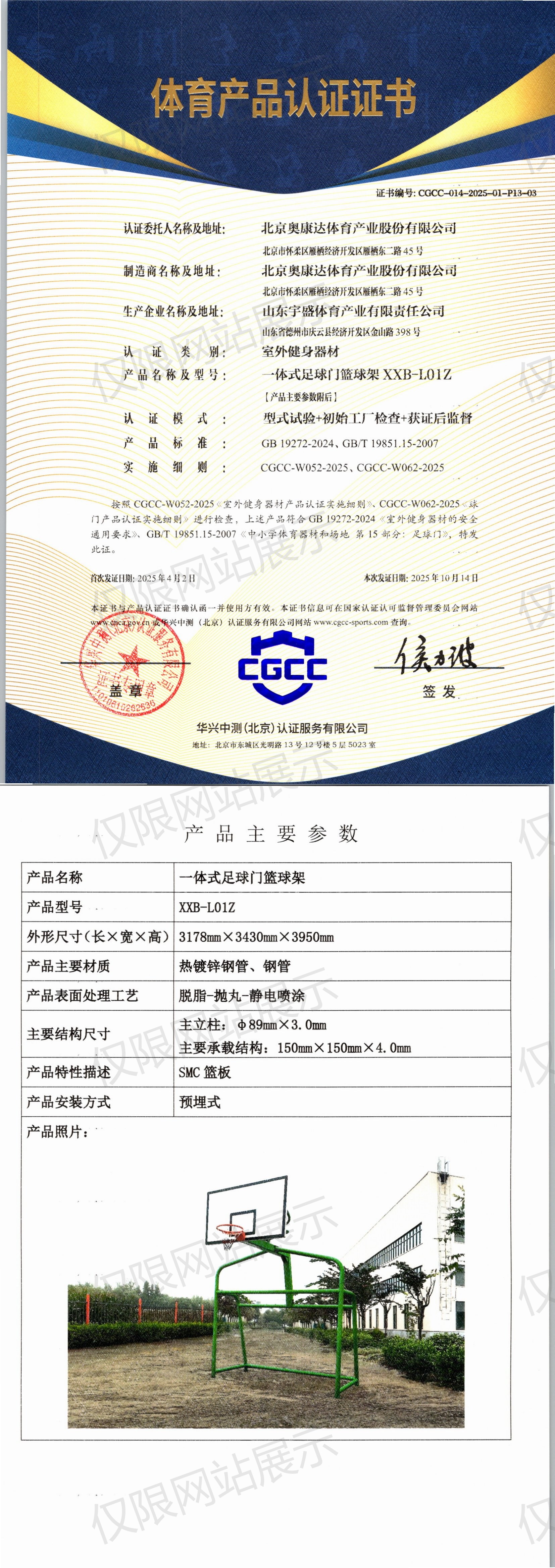 | 1 | 北京奥康达体育产业股份有限公司 | CGCC-014-2025-01-P13-03 | 一体式足球门篮球架 | XXB-L01Z | 山东省德州市庆云县经济开发区金山路398号 | GB 19272-2024、GB/T 19851.15-2007 | 2025-04-02 | 有效 | 查看 |
