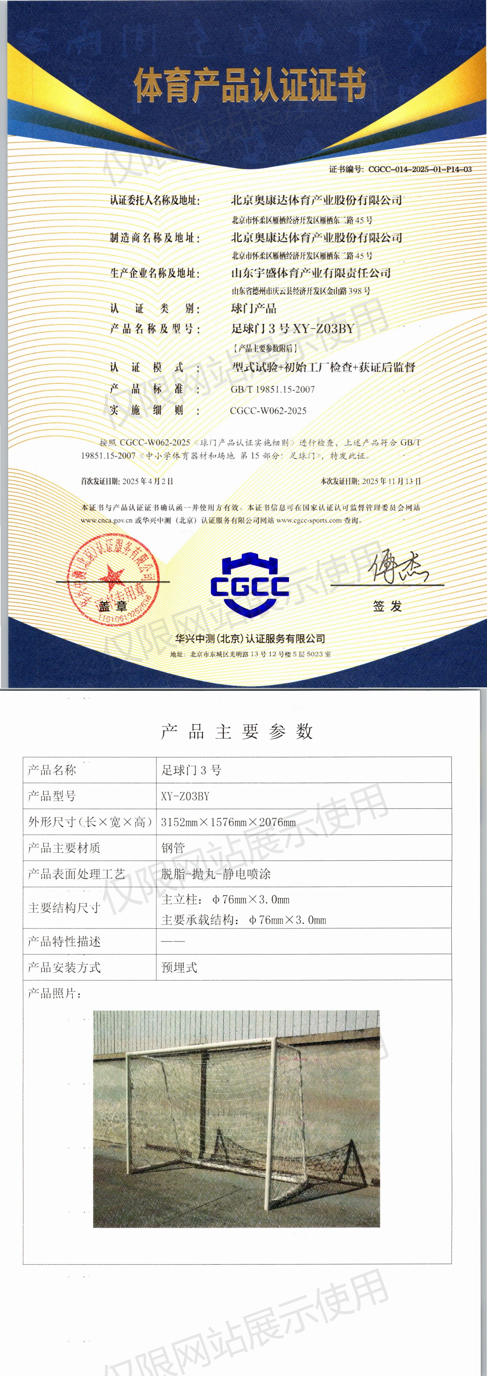 | 5 | 北京奥康达体育产业股份有限公司 | CGCC-014-2025-01-P14-03 | 足球门3号 | XY-Z03BY | 山东省德州市庆云县经济开发区金山路398号 | GB/T 19851.15-2007 | 2025-04-02 | 有效 | 查看 |