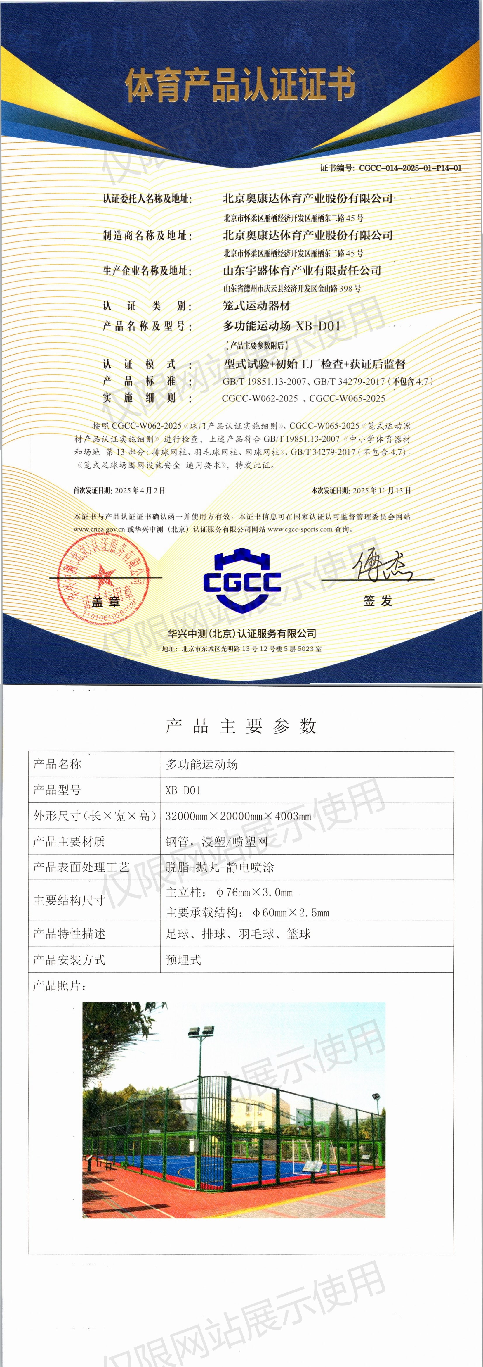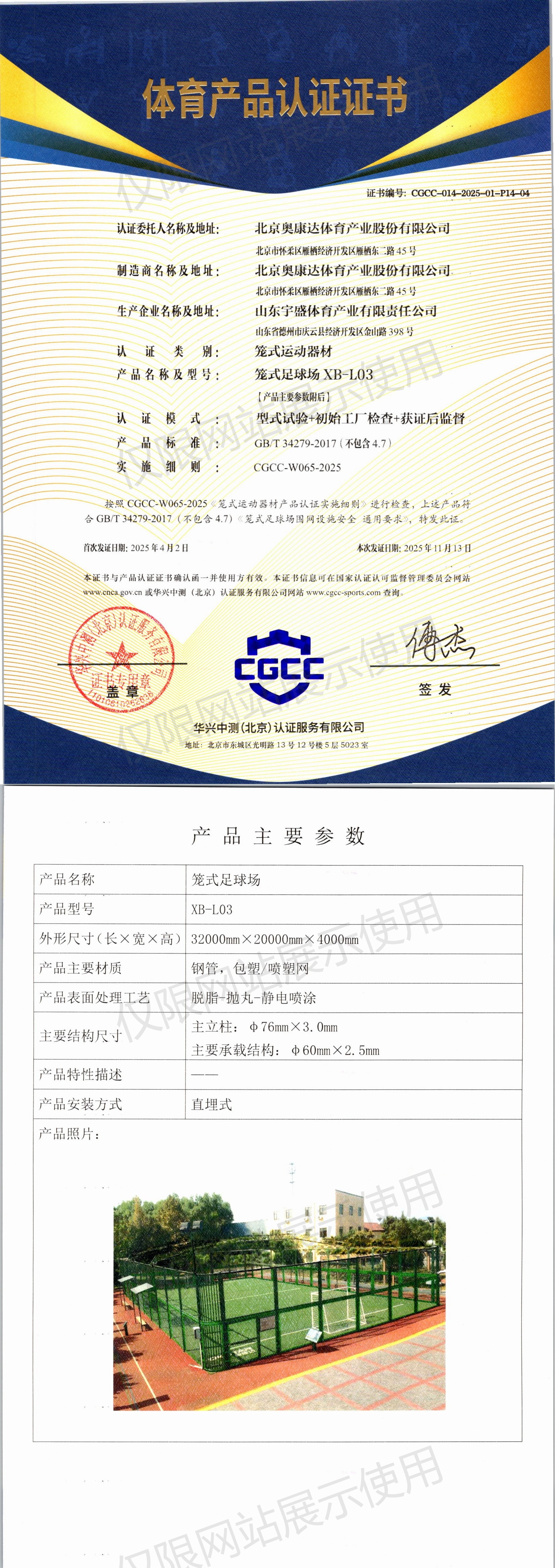| 6 | 北京奥康达体育产业股份有限公司 | CGCC-014-2025-01-P14-04 | 笼式足球场 | XB-L03 | 山东省德州市庆云县经济开发区金山路398号 | GB/T 34279-2017(不包含4.7) | 2025-04-02 | 有效 | 查看 |