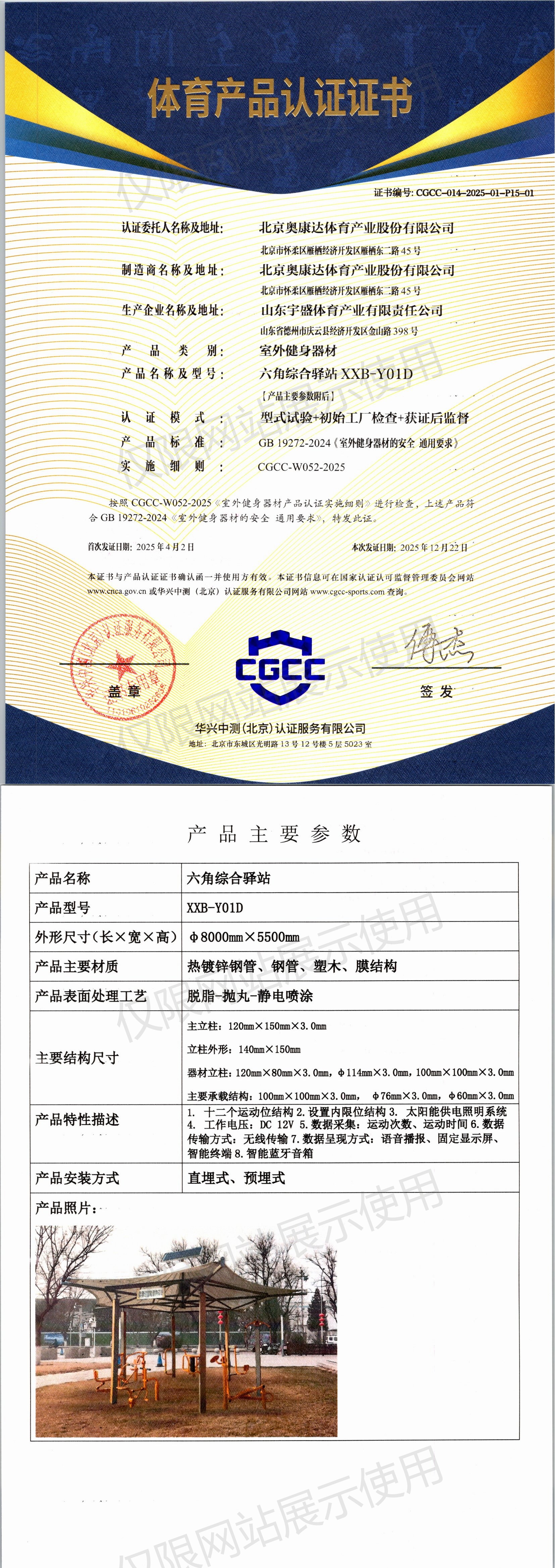 | 7 | 北京奥康达体育产业股份有限公司 | CGCC-014-2025-01-P15-01 | 六角综合驿站 | XXB-Y01D | 山东省德州市庆云县经济开发区金山路398号 | GB 19272-2024 | 2025-04-02 | 有效 | 查看 |