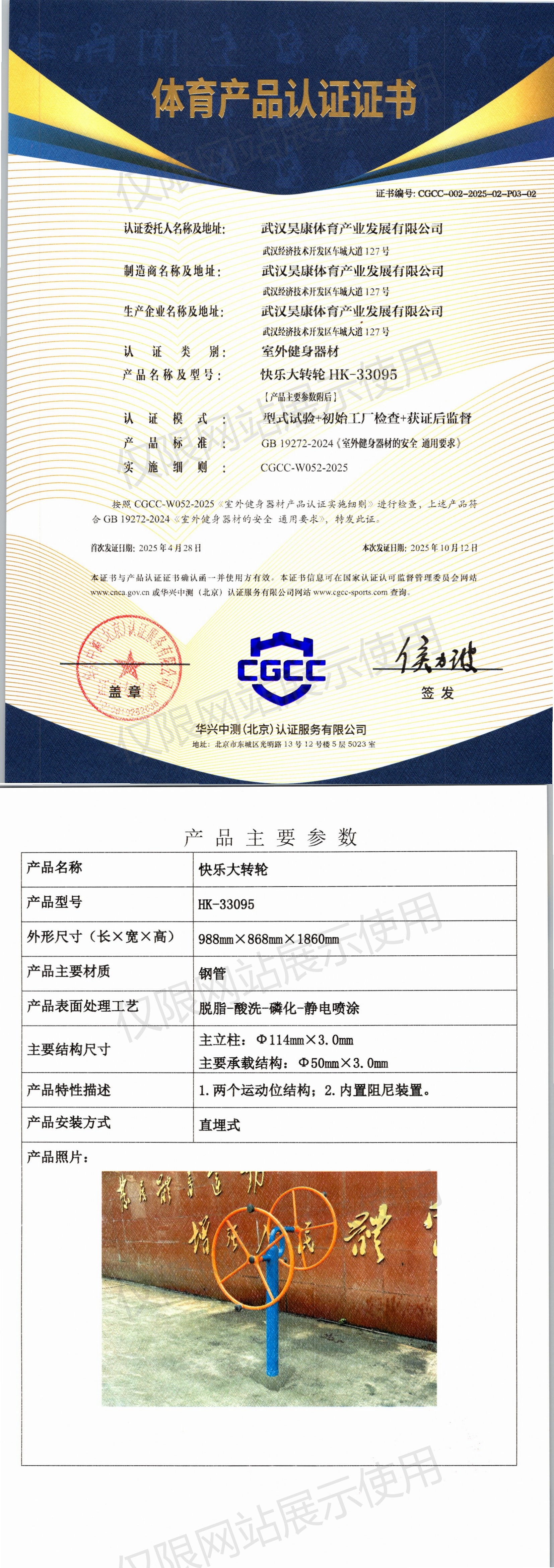 | 7 | 武汉昊康体育产业发展有限公司 | CGCC-002-2025-02-P03-02 | 快乐大转轮 | HK-33095 | 武汉经济技术开发区车城大道127号 | GB 19272-2024 | 2025-04-28 | 有效 | 查看 |