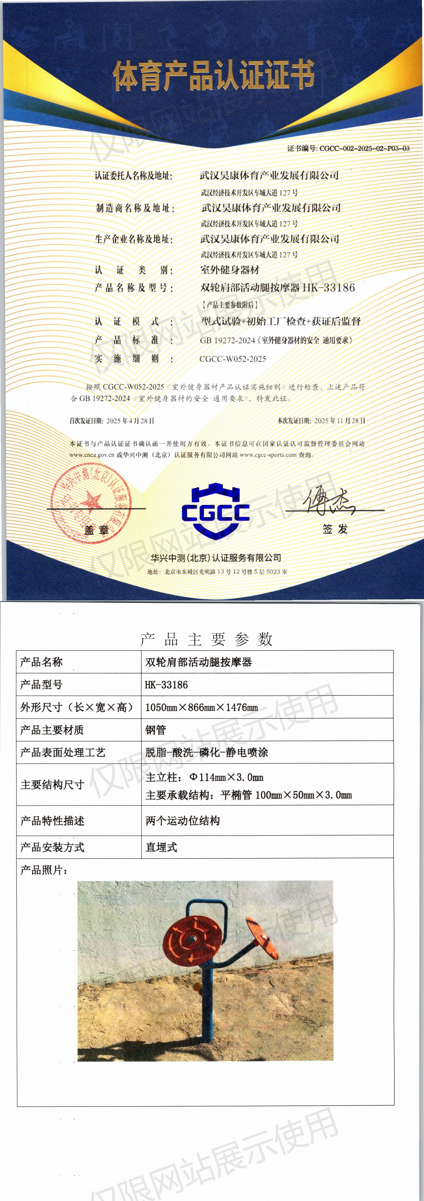 | 10 | 武汉昊康体育产业发展有限公司 | CGCC-002-2025-02-P03-01 | 太极推揉器 | HK-33091 | 武汉经济技术开发区车城大道127号 | GB 19272-2024 | 2025-04-28 | 有效 | 查看 |