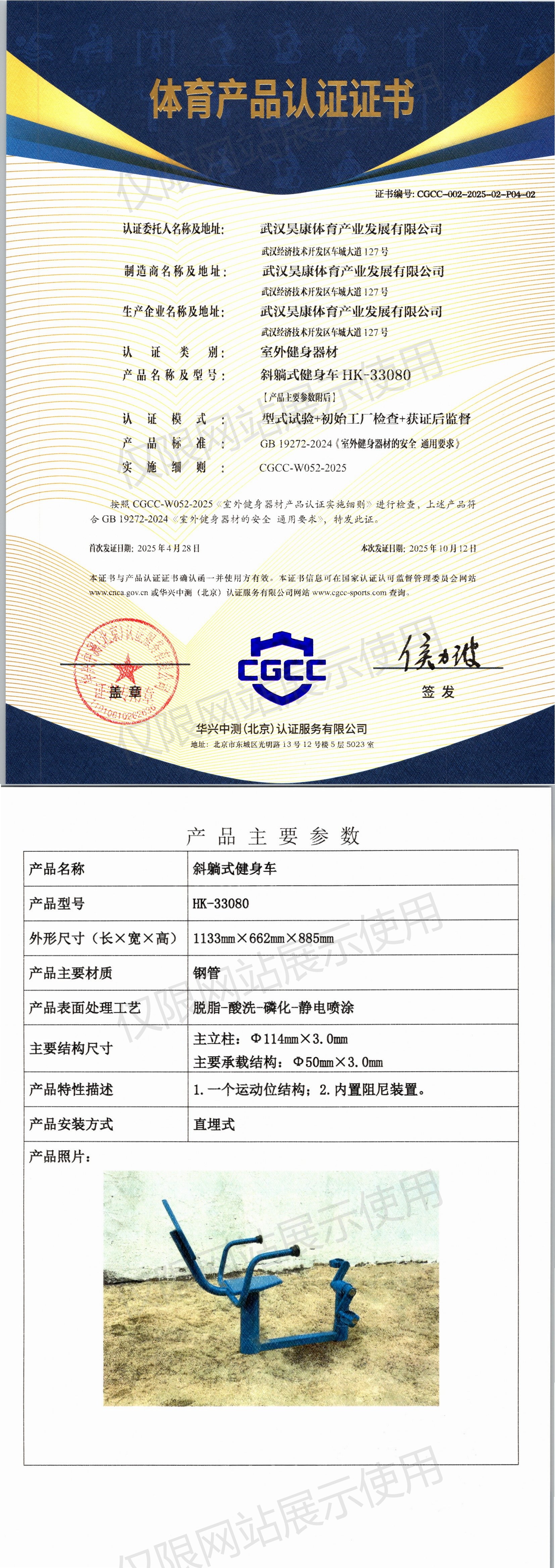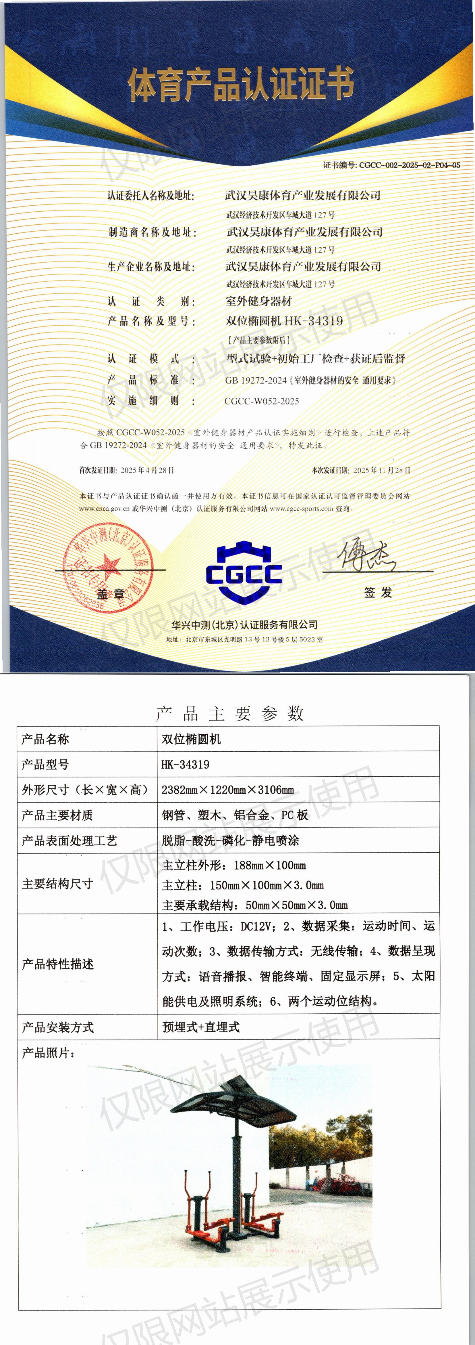 | 5 | 武汉昊康体育产业发展有限公司 | CGCC-002-2025-02-P04-05 | 双位椭圆机 | HK-34319 | 武汉经济技术开发区车城大道127号 | GB 19272-2024 | 2025-04-28 | 有效 | 查看 |