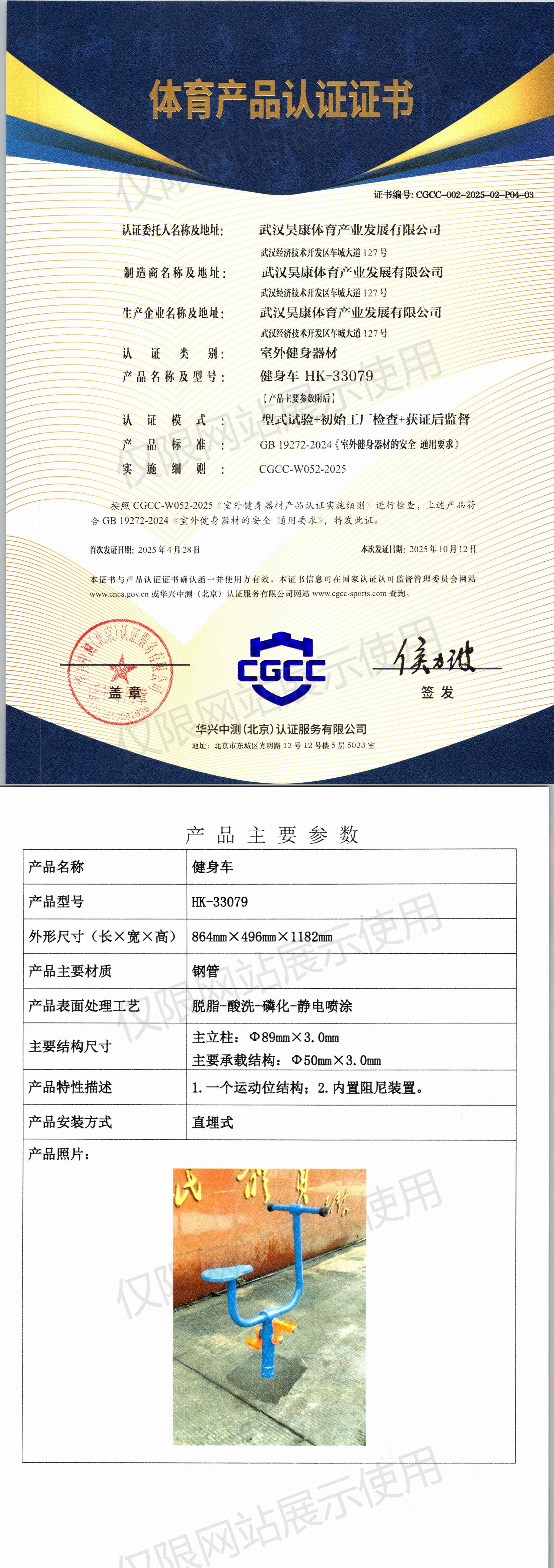 | 7 | 武汉昊康体育产业发展有限公司 | CGCC-002-2025-02-P04-03 | 健身车 | HK-33079 | 武汉经济技术开发区车城大道127号 | GB 19272-2024 | 2025-04-28 | 有效 | 查看 |