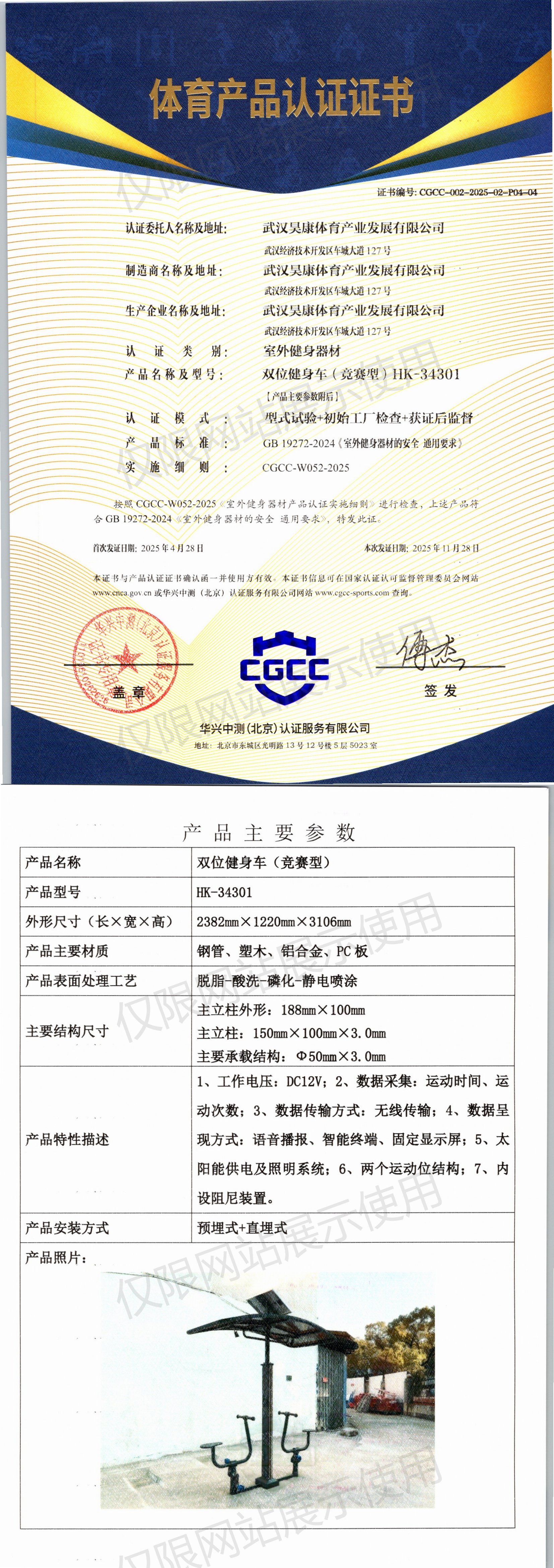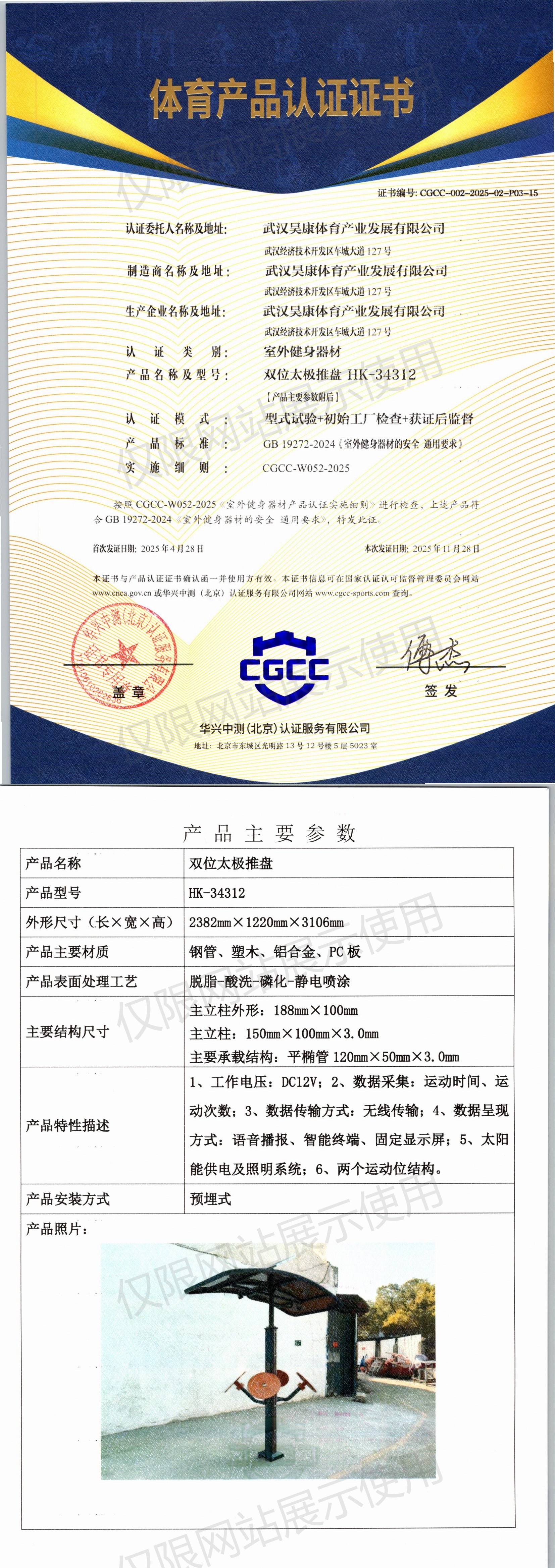 | 4 | 武汉昊康体育产业发展有限公司 | CGCC-002-2025-02-P03-15 | 双位太极推盘 | HK-34312 | 武汉经济技术开发区车城大道127号 | GB 19272-2024 | 2025-04-28 | 有效 | 查看 |