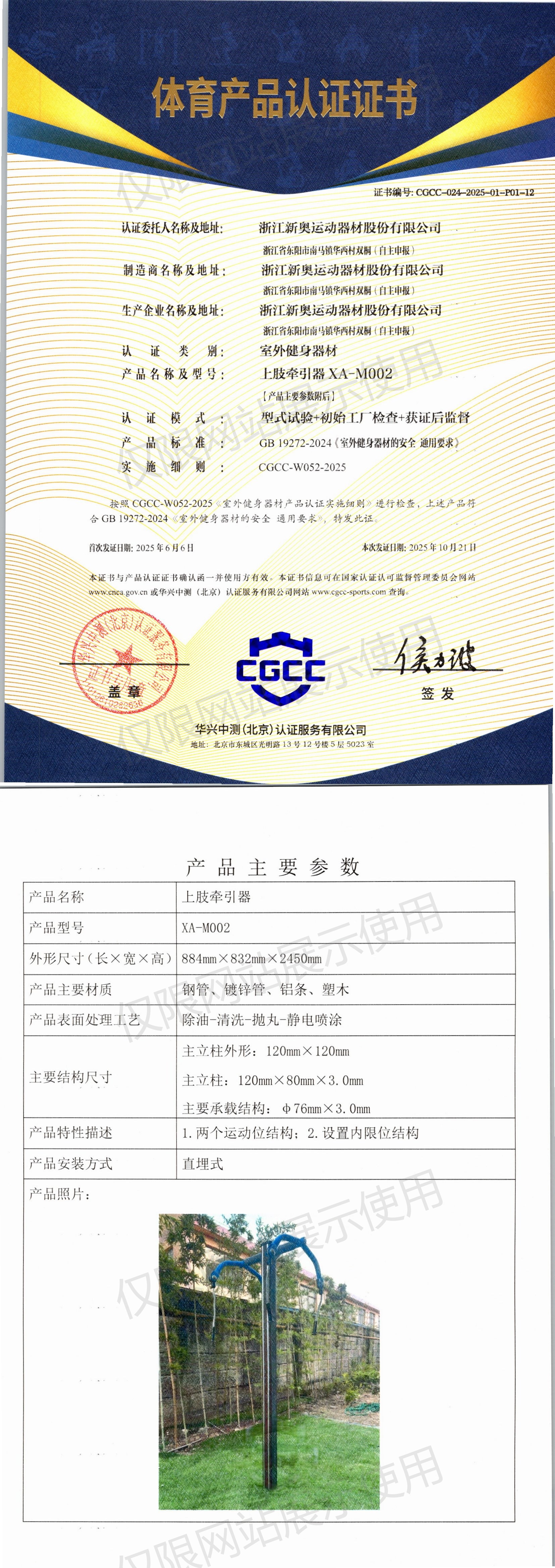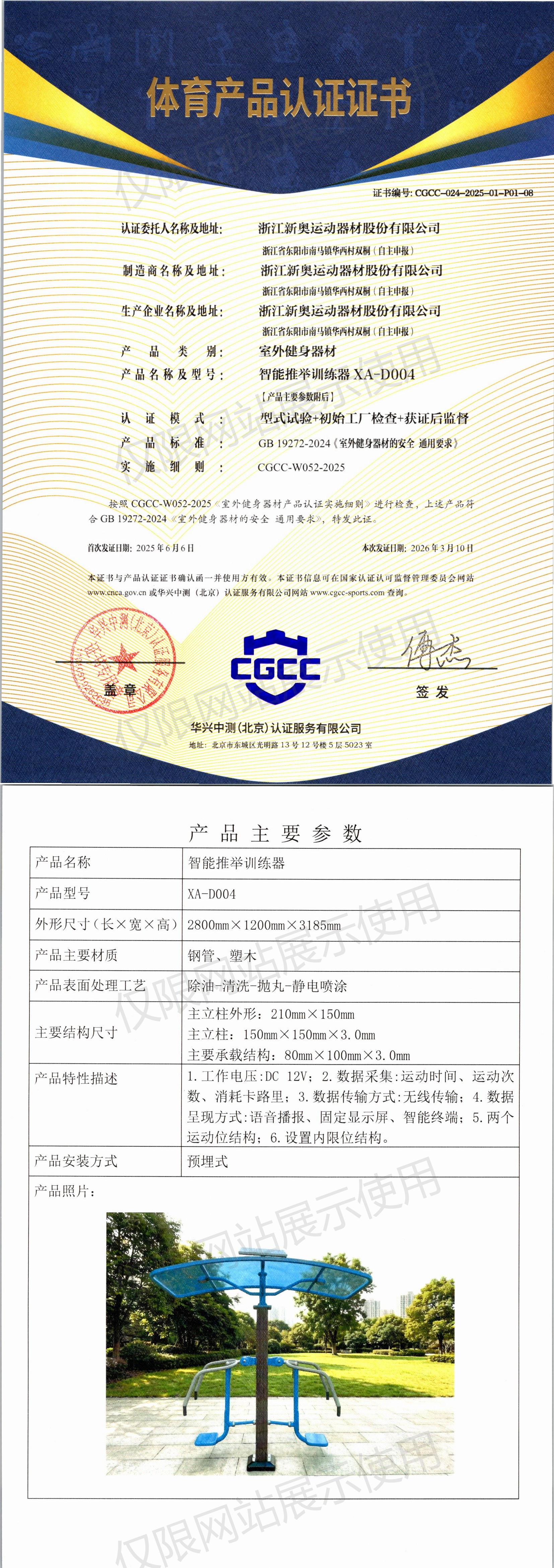 | 3 | 浙江新奥运动器材股份有限公司 | CGCC-024-2025-01-P01-08 | 智能推举训练器 | XA-D004 | 浙江省东阳市南马镇华西村双桐(自主申报) | GB 19272-2024 | 2025-06-06 | 有效 | 查看 |