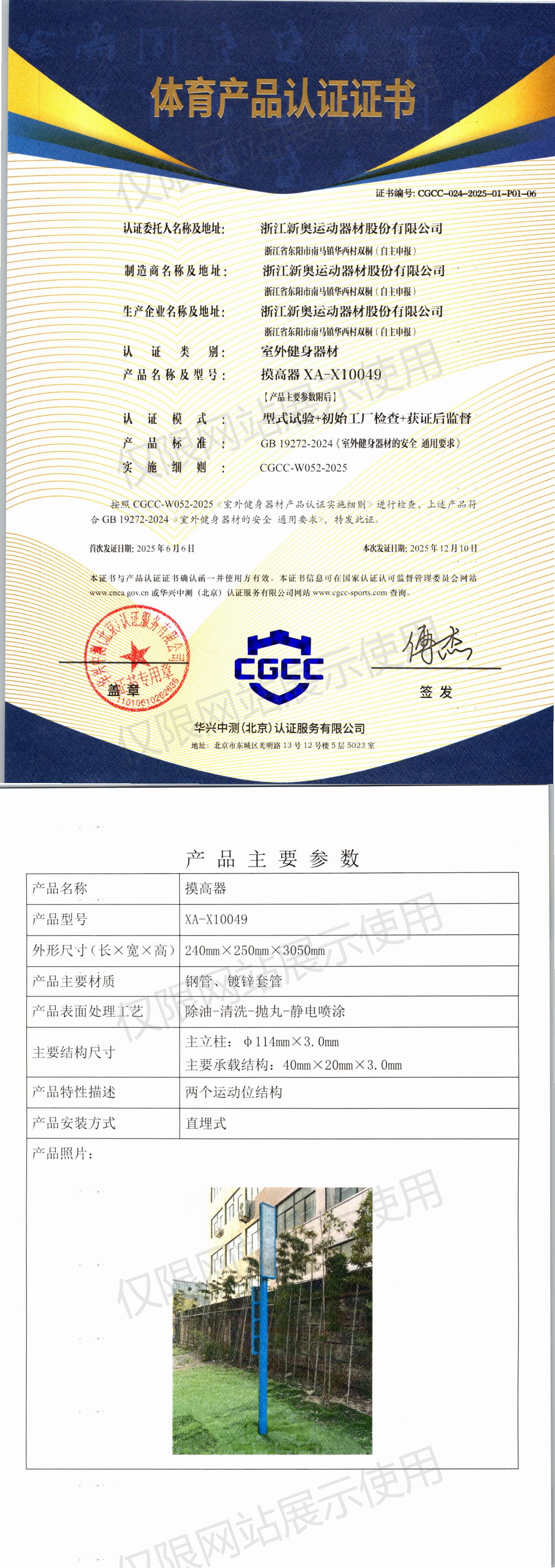 | 1 | 浙江新奥运动器材股份有限公司 | CGCC-024-2025-01-P01-06 | 摸高器 | XA-X10049 | 浙江省东阳市南马镇华西村双桐(自主申报) | GB 19272-2024 | 2025-06-06 | 有效 | 查看 |