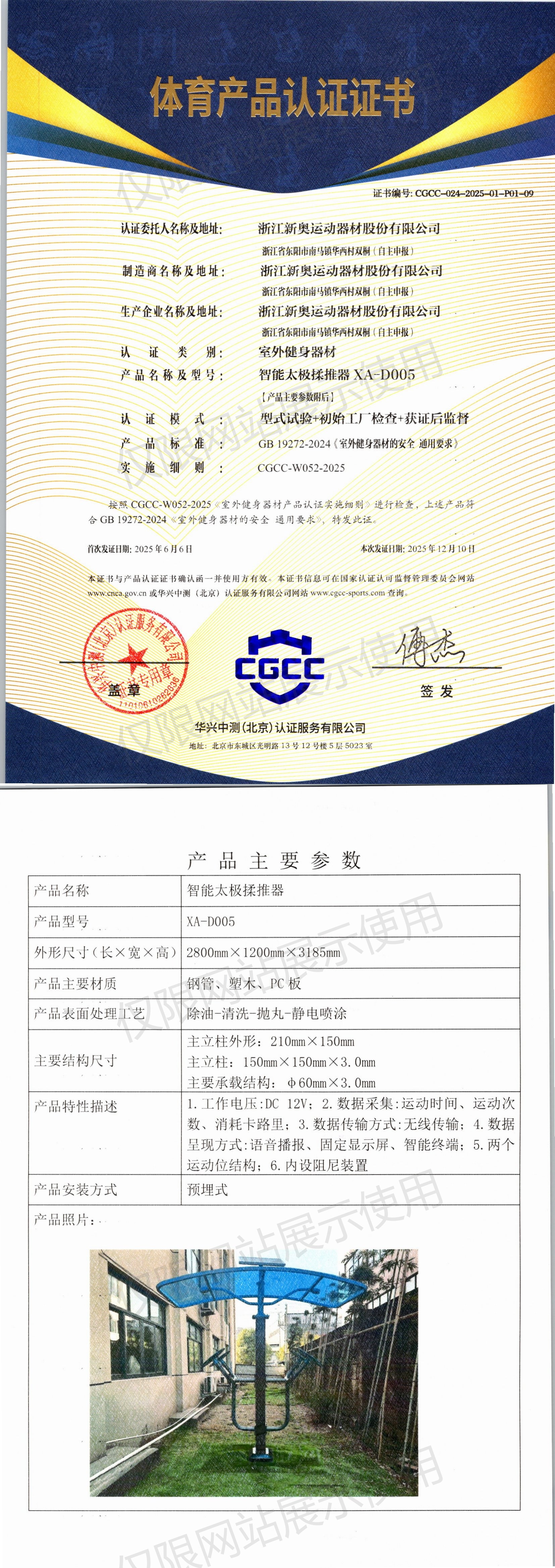 | 4 | 浙江新奥运动器材股份有限公司 | CGCC-024-2025-01-P01-09 | 智能太极揉推器 | XA-D005 | 浙江省东阳市南马镇华西村双桐(自主申报) | GB 19272-2024 | 2025-06-06 | 有效 | 查看 |