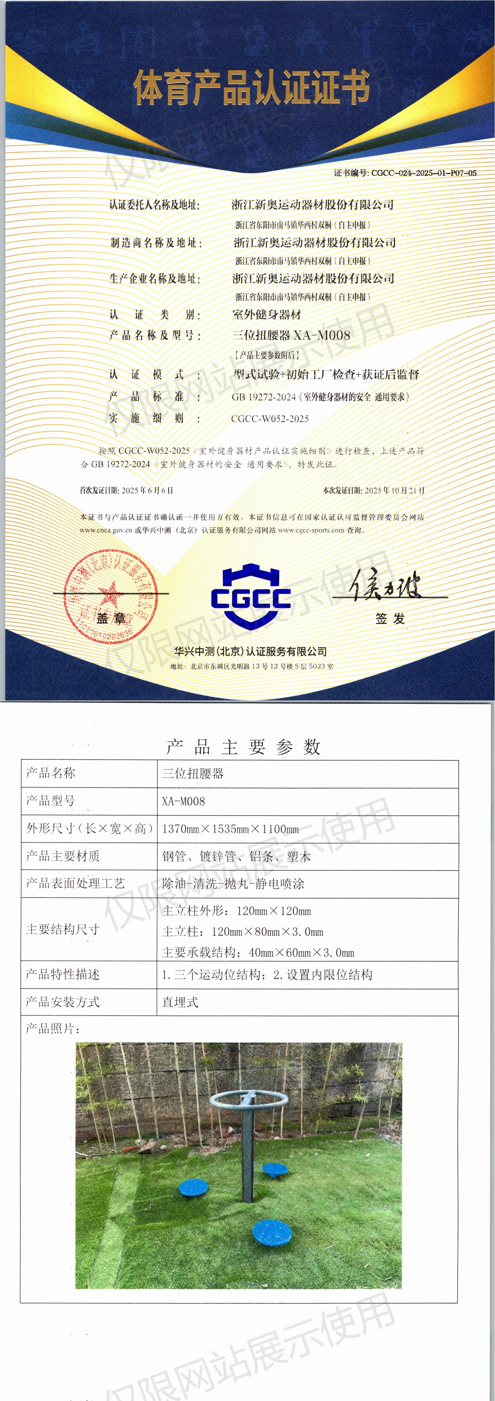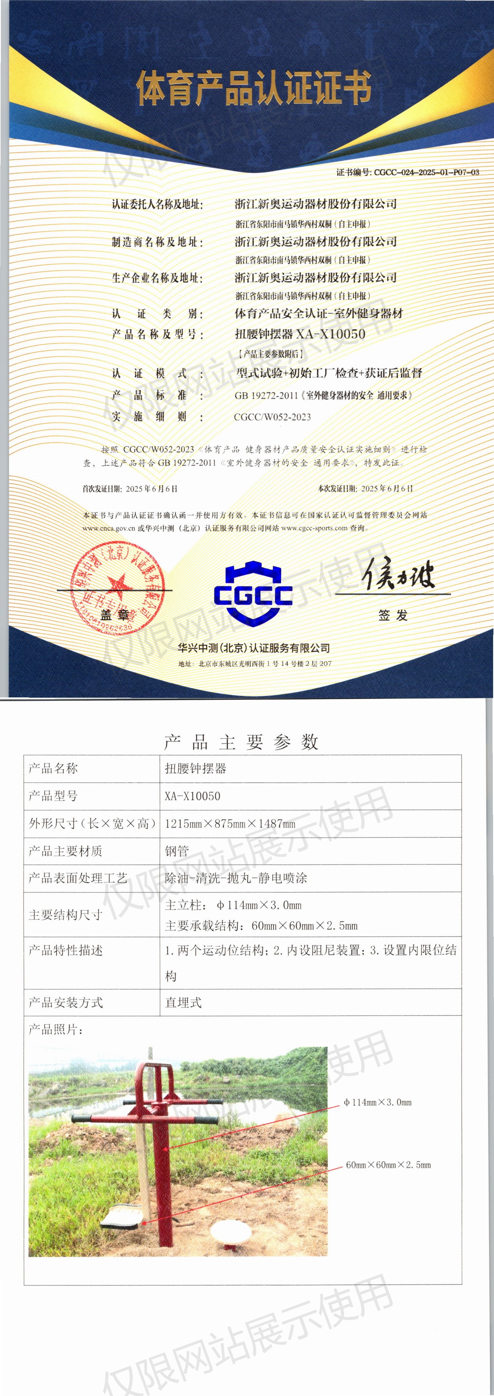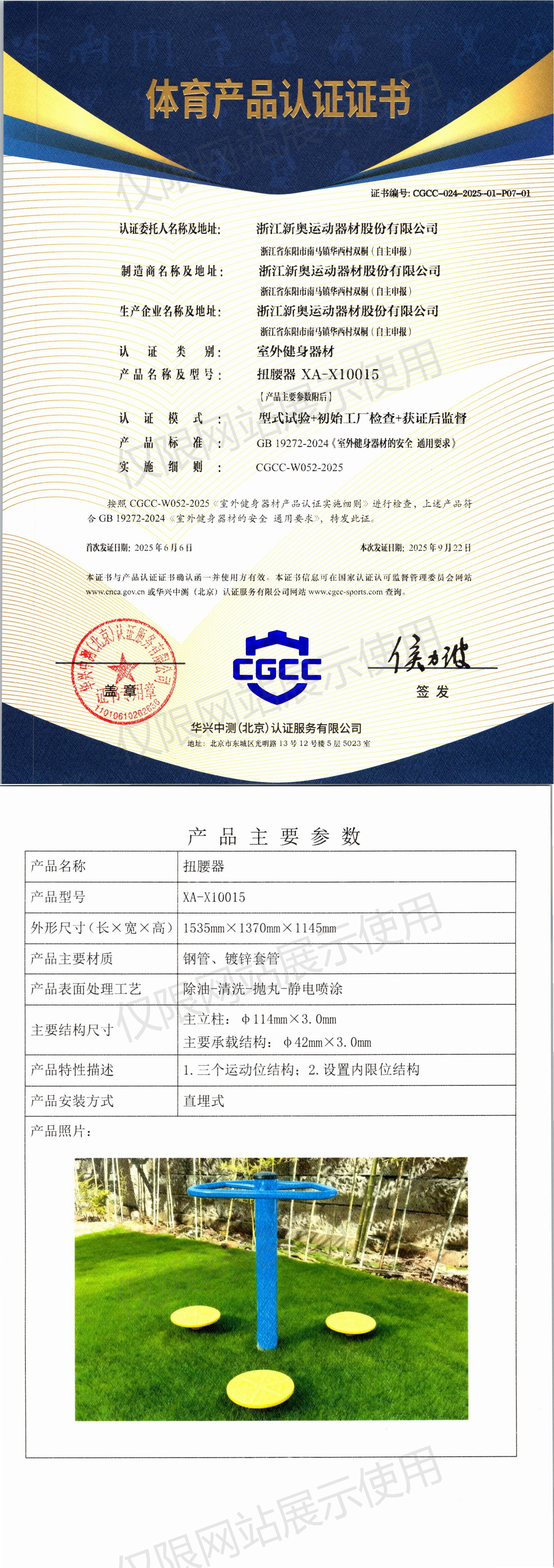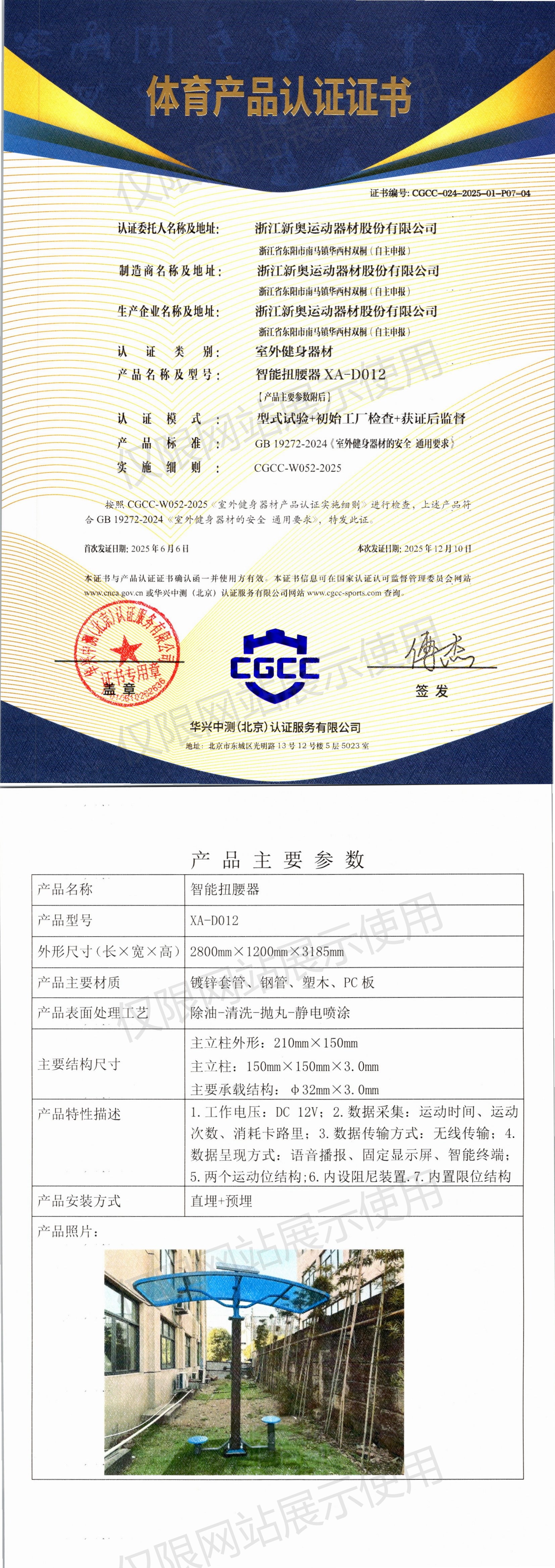 | 9 | 浙江新奥运动器材股份有限公司 | CGCC-024-2025-01-P07-04 | 智能扭腰器 | XA-D012 | 浙江省东阳市南马镇华西村双桐(自主申报) | GB 19272-2024 | 2025-06-06 | 有效 | 查看 |