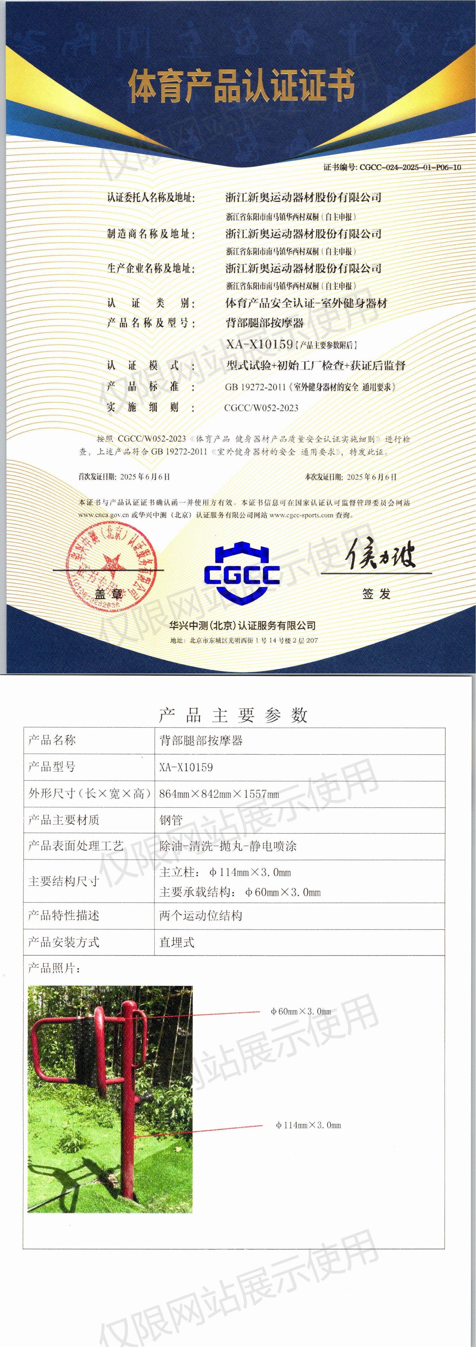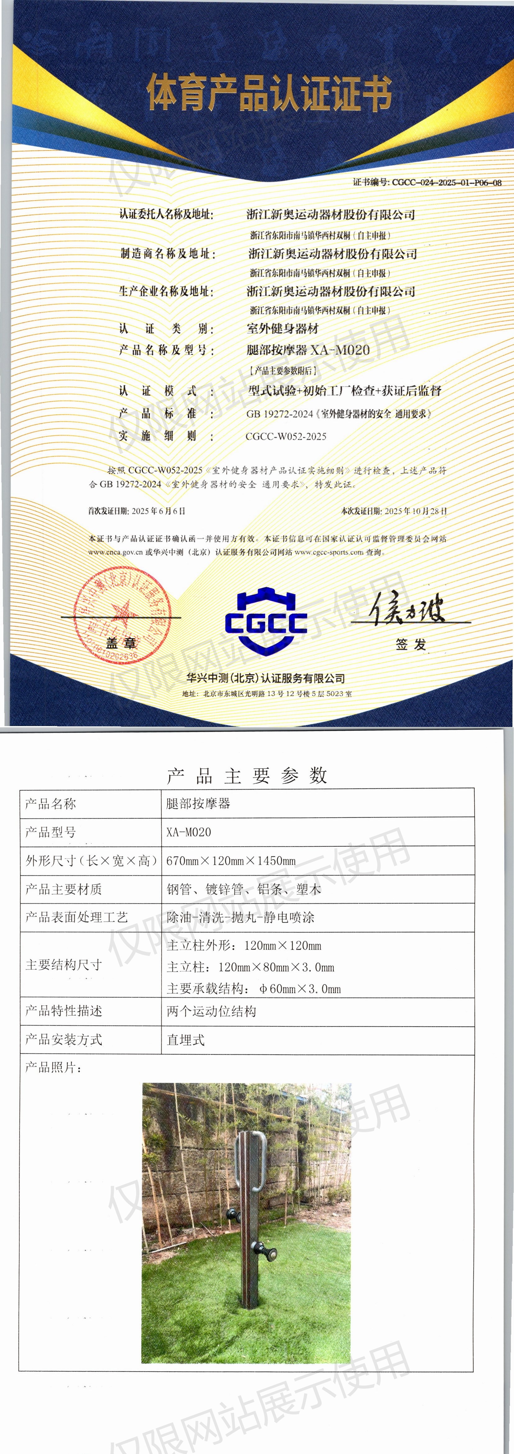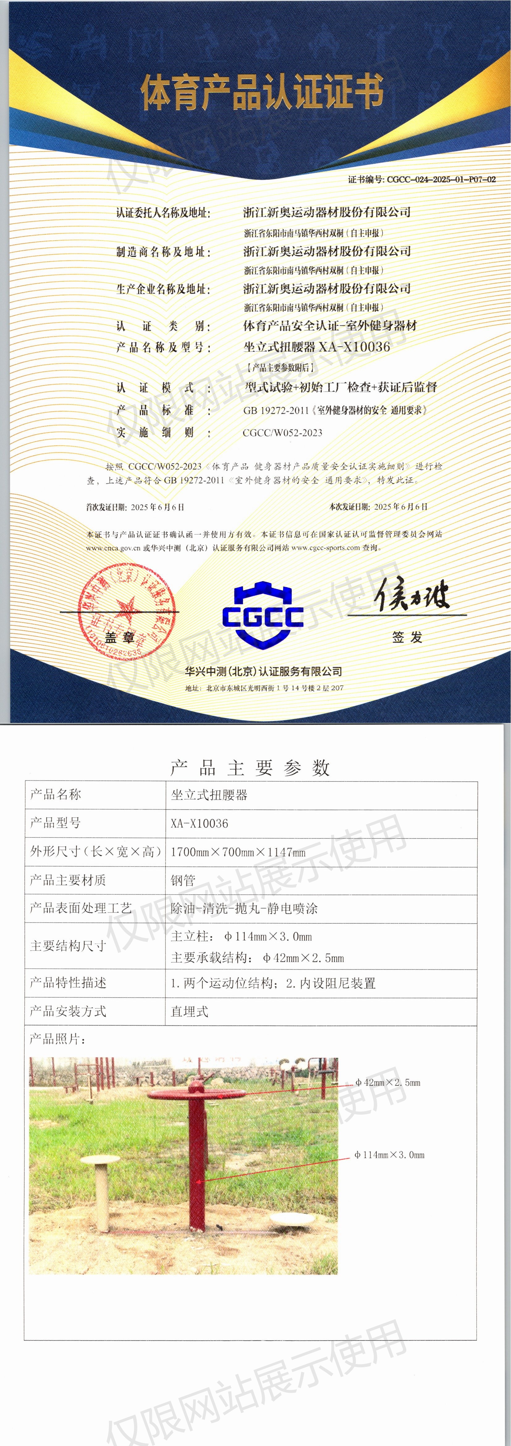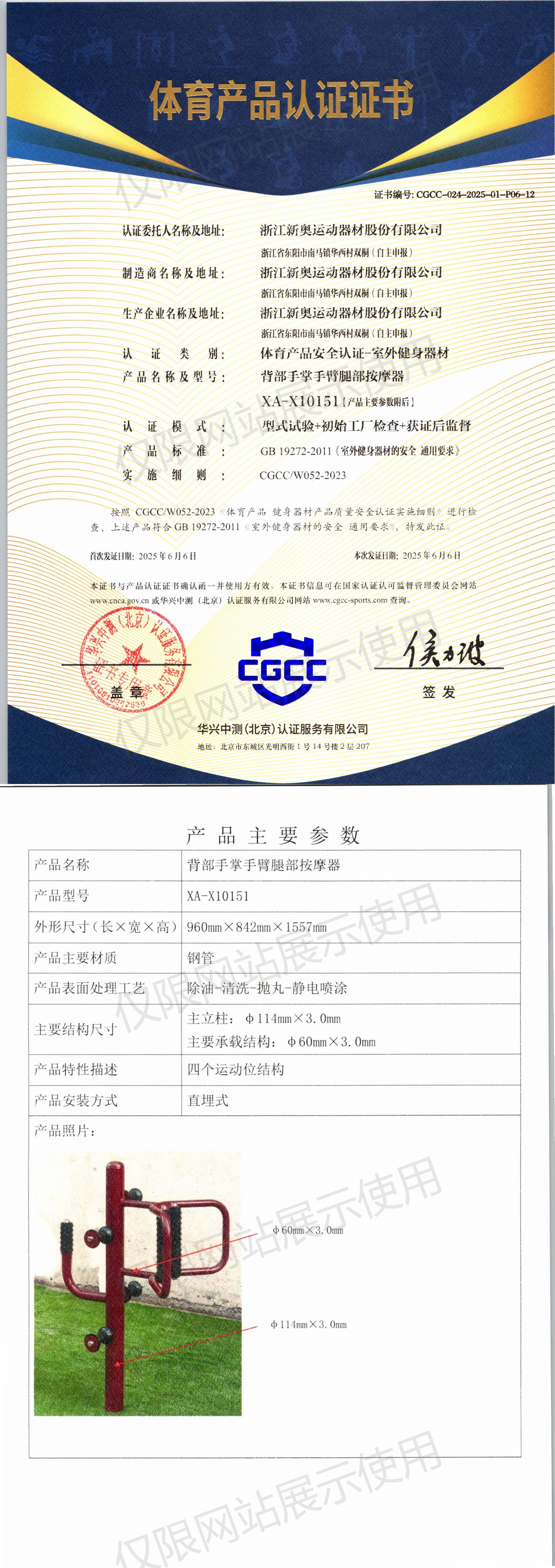 | 9 | 浙江新奥运动器材股份有限公司 | CGCC-024-2025-01-P07-04 | 智能扭腰器 | XA-D012 | 浙江省东阳市南马镇华西村双桐(自主申报) | GB 19272-2024 | 2025-06-06 | 有效 | 查看 |