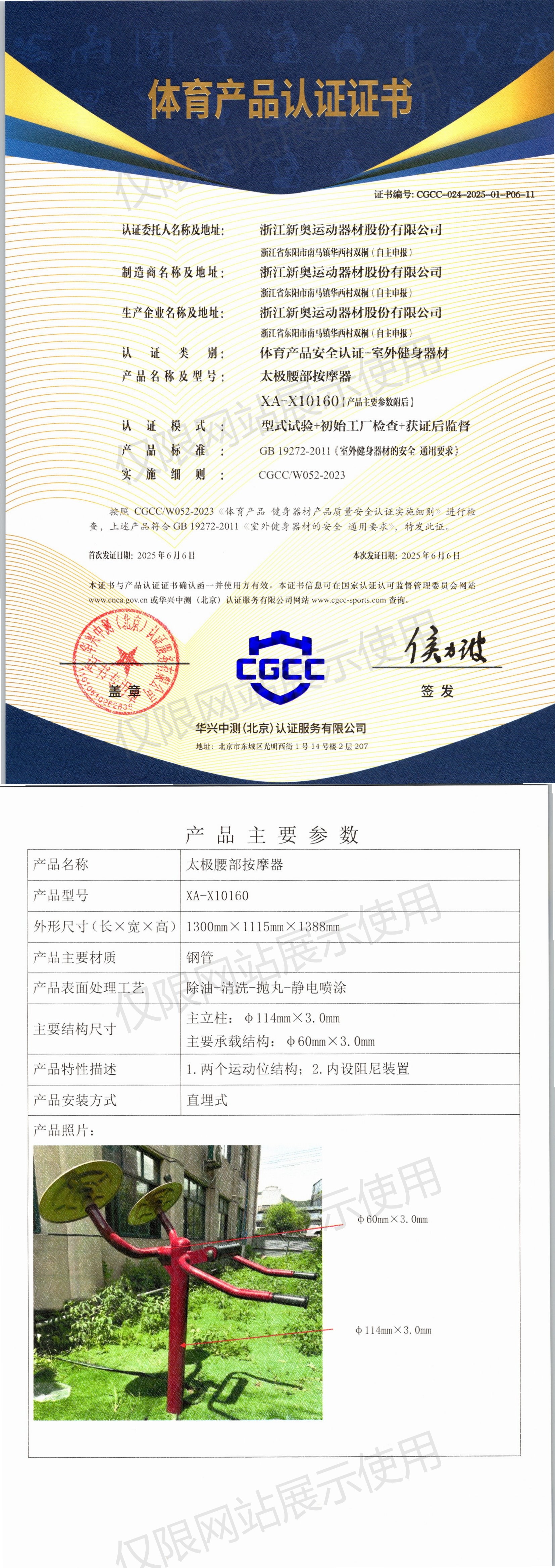 | 4 | 浙江新奥运动器材股份有限公司 | CGCC-024-2025-01-P06-11 | 太极腰部按摩器 | XA-X10160 | 浙江省东阳市南马镇华西村双桐(自主申报) | GB 19272-2011 | 2025-06-06 | 有效 | 查看 |