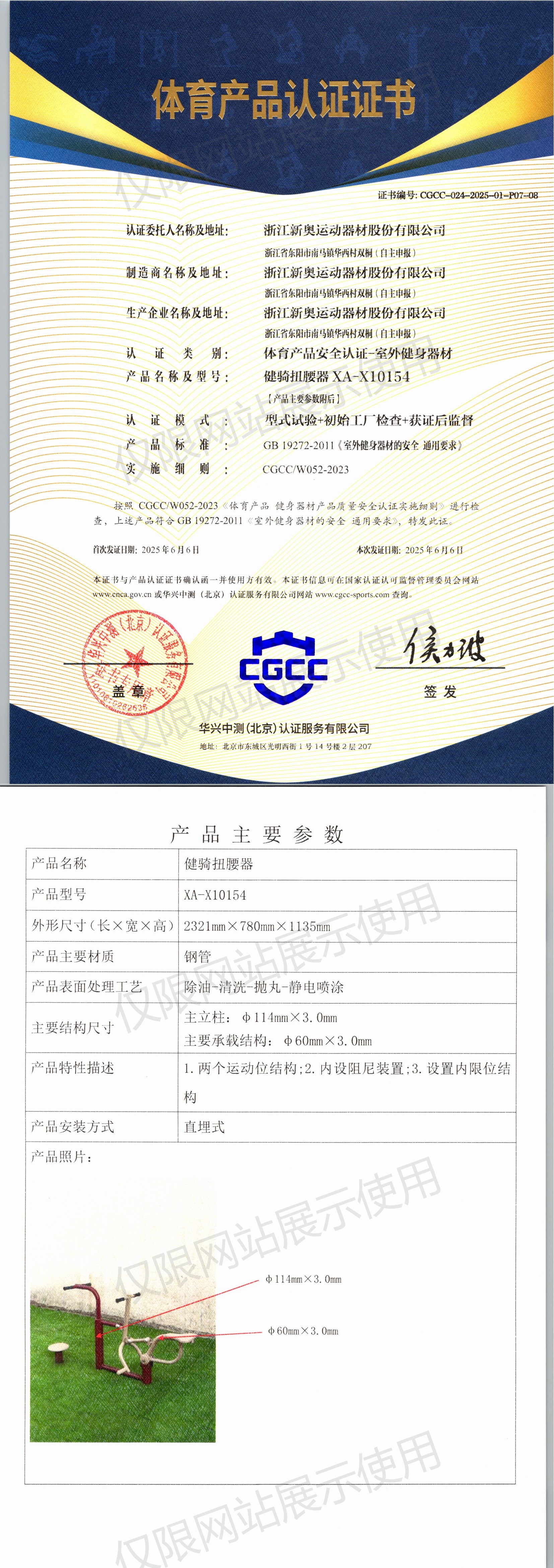 | 3 | 浙江新奥运动器材股份有限公司 | CGCC-024-2025-01-P07-08 | 健骑扭腰器 | XA-X10154 | 浙江省东阳市南马镇华西村双桐(自主申报) | GB 19272-2011 | 2025-06-06 | 有效 | 查看 |