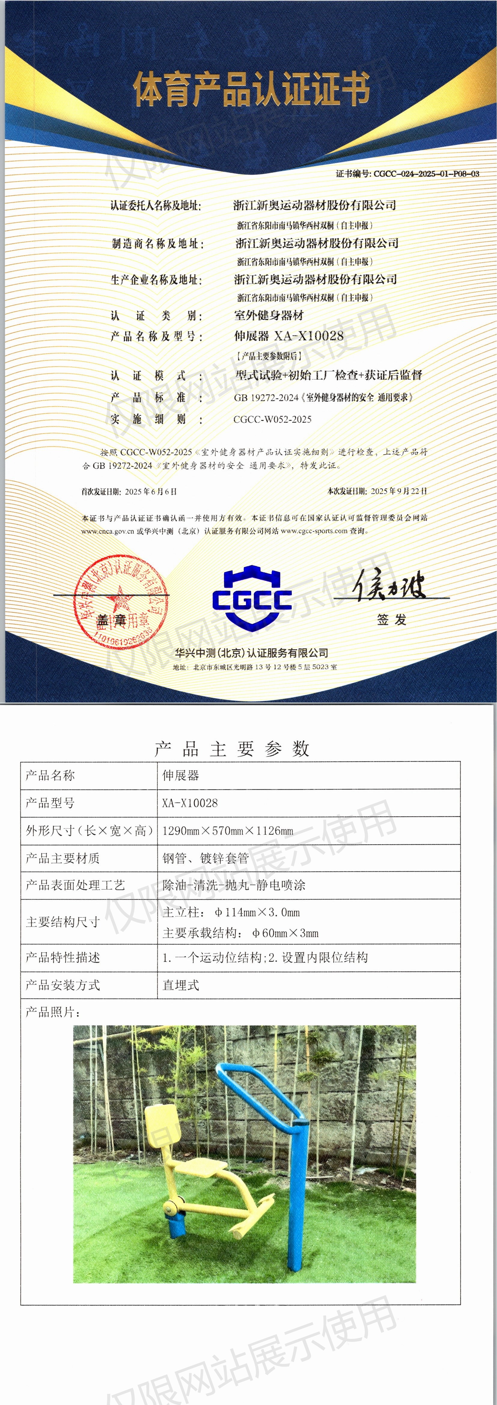 | 5 | 浙江新奥运动器材股份有限公司 | CGCC-024-2025-01-P08-02 | 伸腰伸背器 | XA-X10024 | 浙江省东阳市南马镇华西村双桐(自主申报) | GB 19272-2024 | 2025-06-06 | 有效 | 查看 |