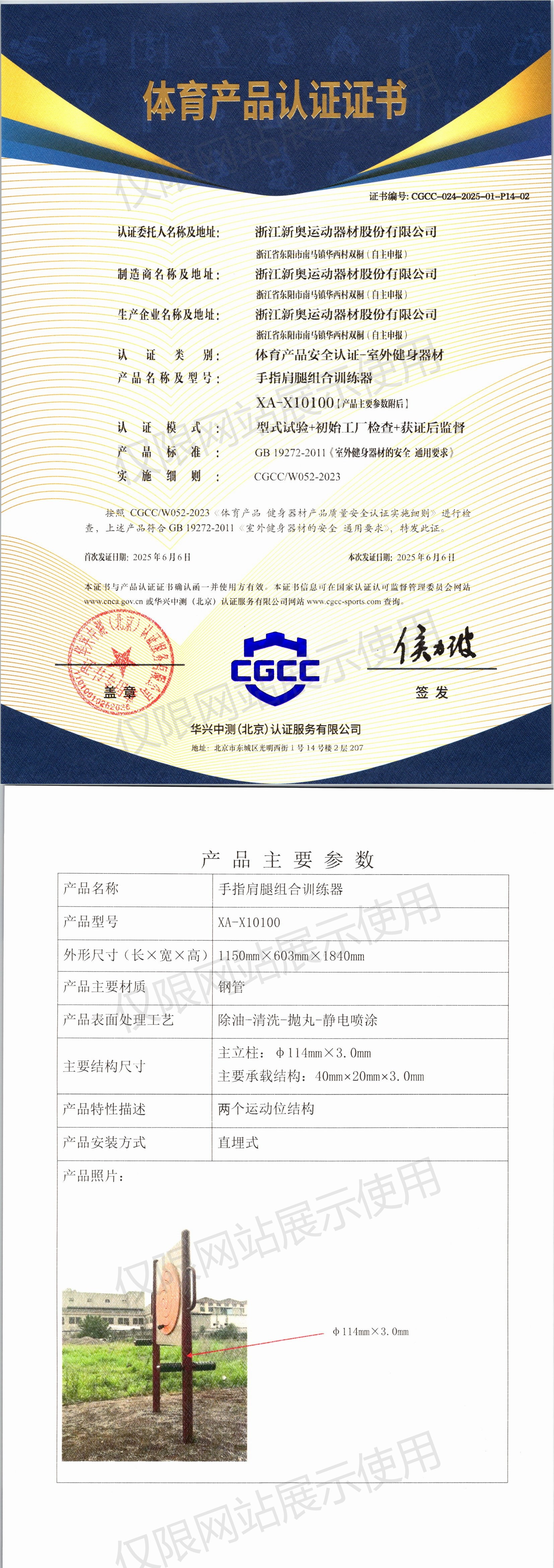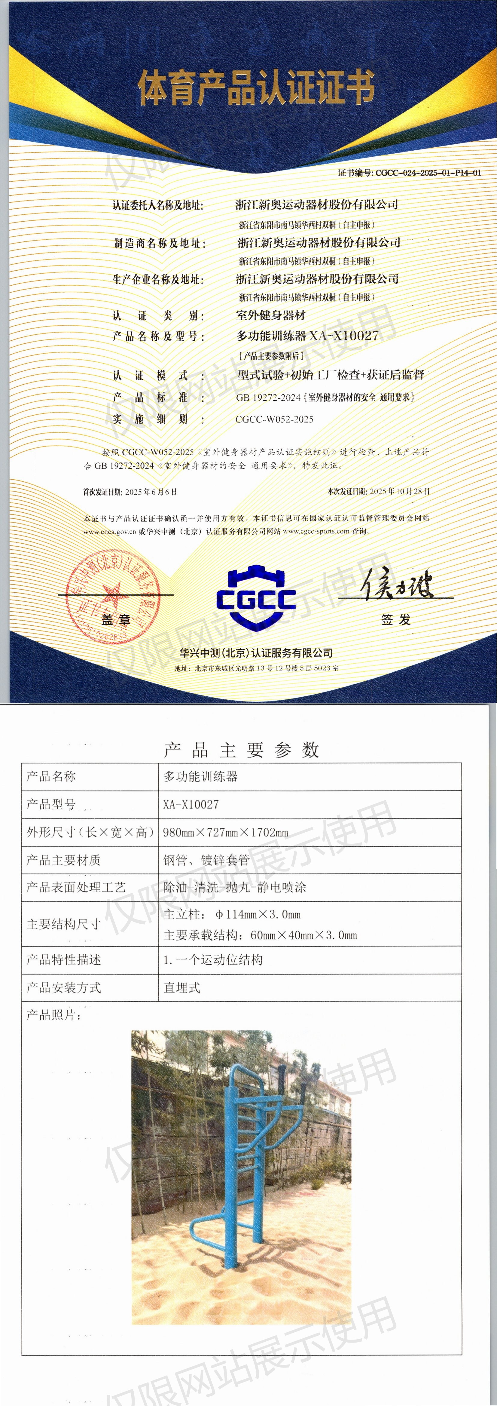| 8 | 浙江新奥运动器材股份有限公司 | CGCC-024-2025-01-P14-01 | 多功能训练器 | XA-X10027 | 浙江省东阳市南马镇华西村双桐(自主申报) | GB 19272-2024 | 2025-06-06 | 有效 | 查看 |