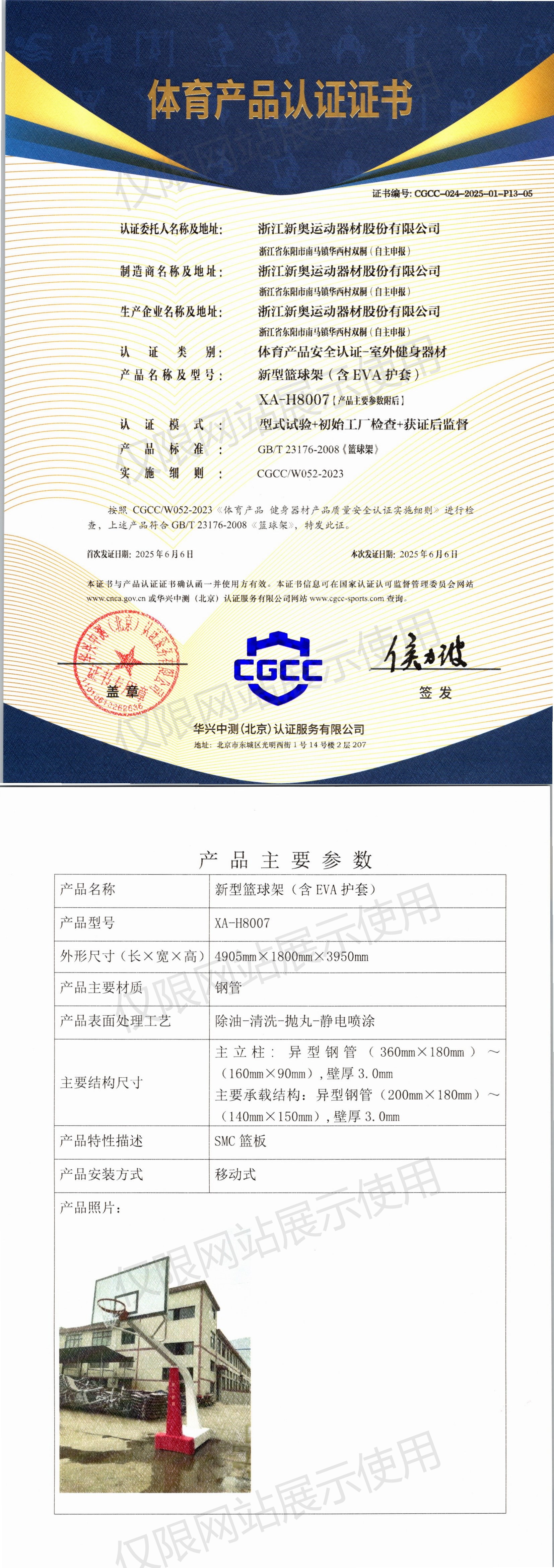 | 7 | 浙江新奥运动器材股份有限公司 | CGCC-024-2025-01-P13-05 | 新型篮球架(含EVA护套) | XA-H8007 | 浙江省东阳市南马镇华西村双桐(自主申报) | GB/T 23176-2008 | 2025-06-06 | 有效 | 查看 |