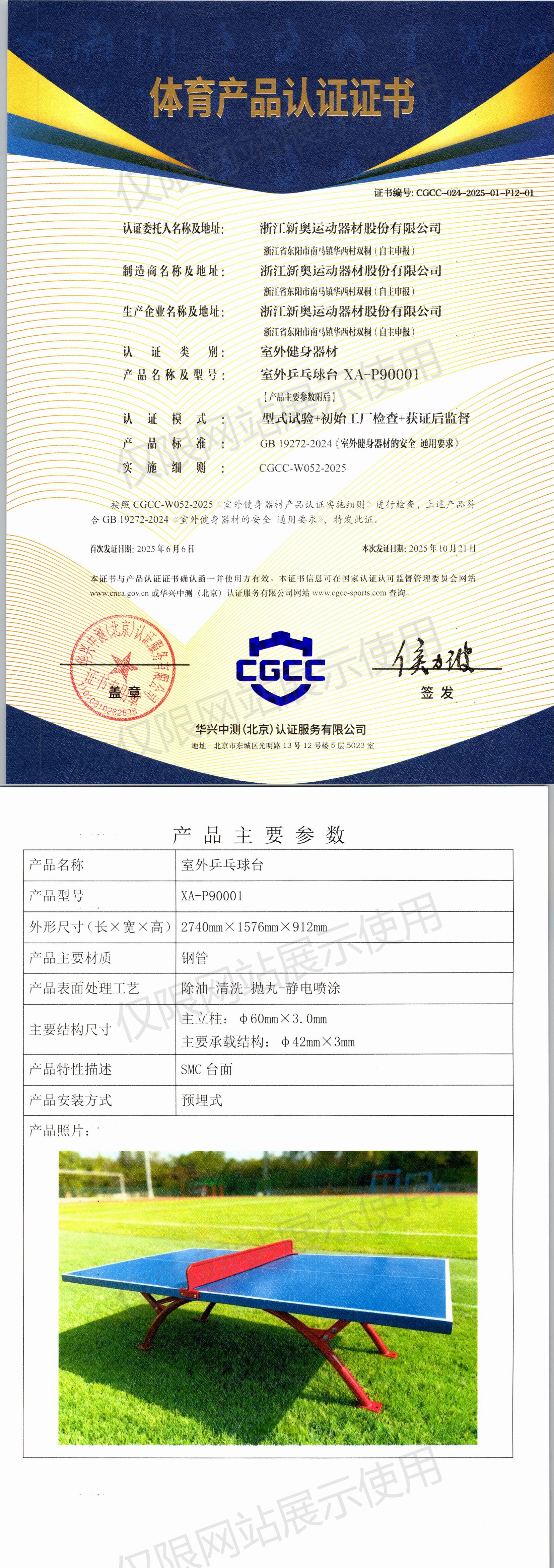 | 1 | 浙江新奥运动器材股份有限公司 | CGCC-024-2025-01-P12-01 | 室外乒乓球台 | XA-P90001 | 浙江省东阳市南马镇华西村双桐(自主申报) | GB 19272-2024 | 2025-06-06 | 有效 | 查看 |