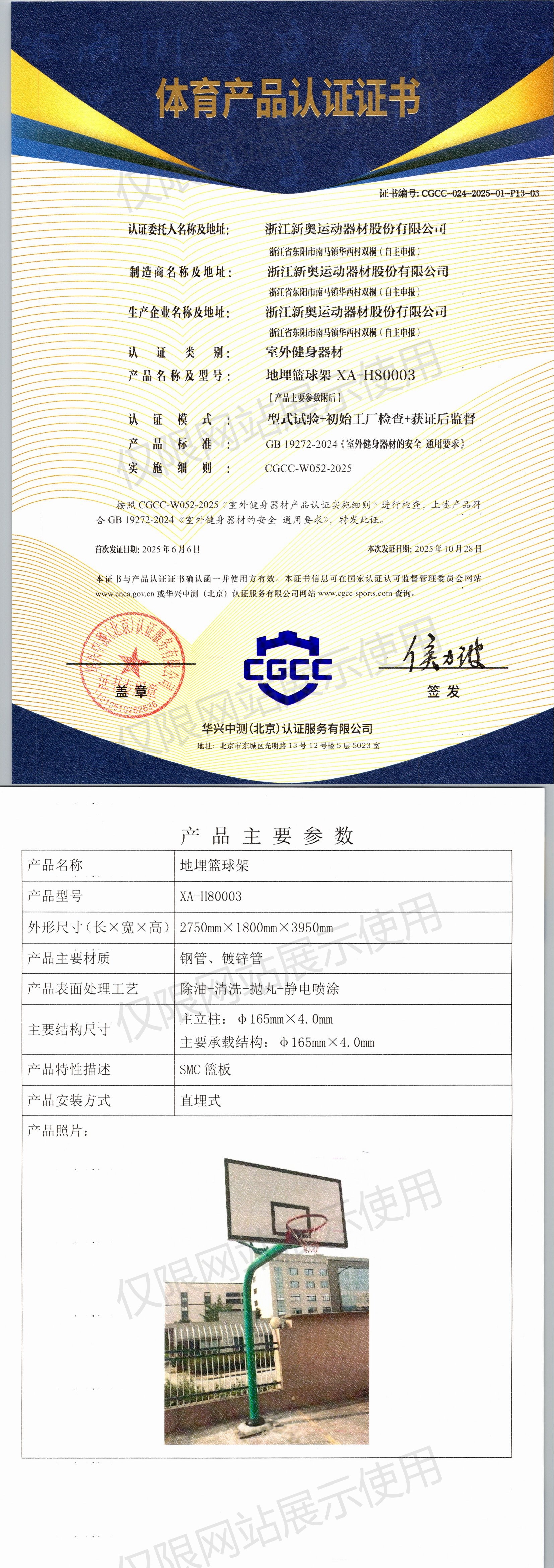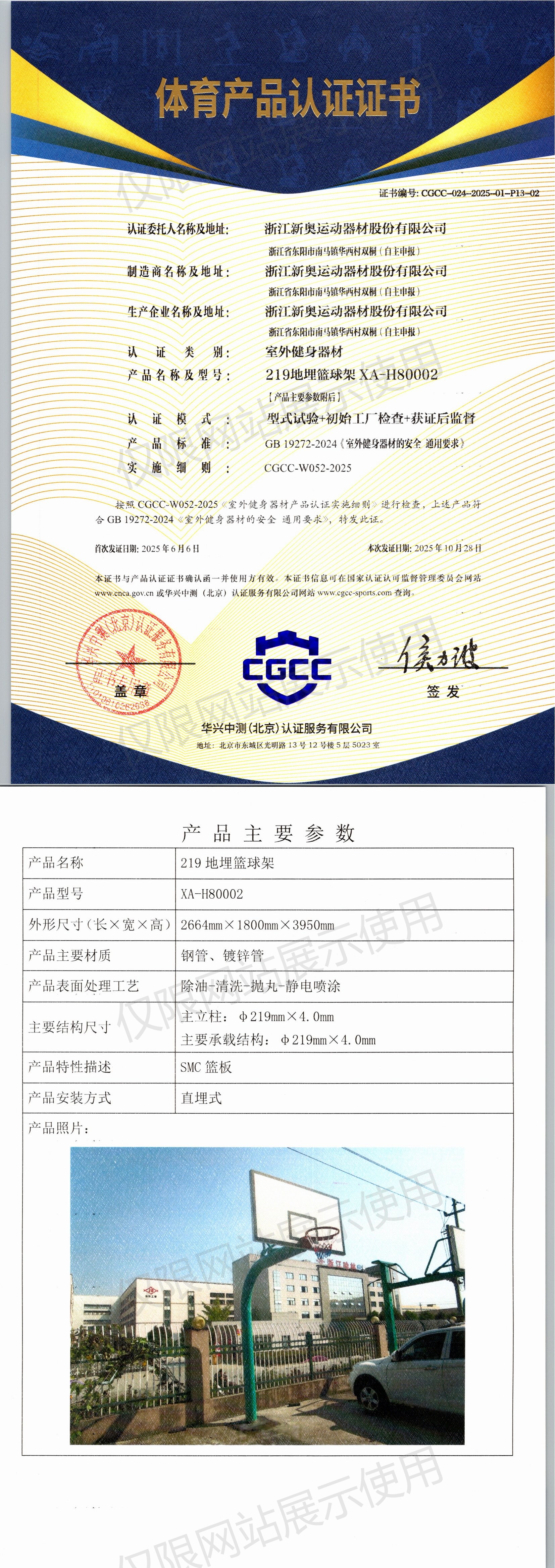 | 4 | 浙江新奥运动器材股份有限公司 | CGCC-024-2025-01-P13-02 | 219地埋篮球架 | XA-H80002 | 浙江省东阳市南马镇华西村双桐(自主申报) | GB 19272-2024 | 2025-06-06 | 有效 | 查看 |