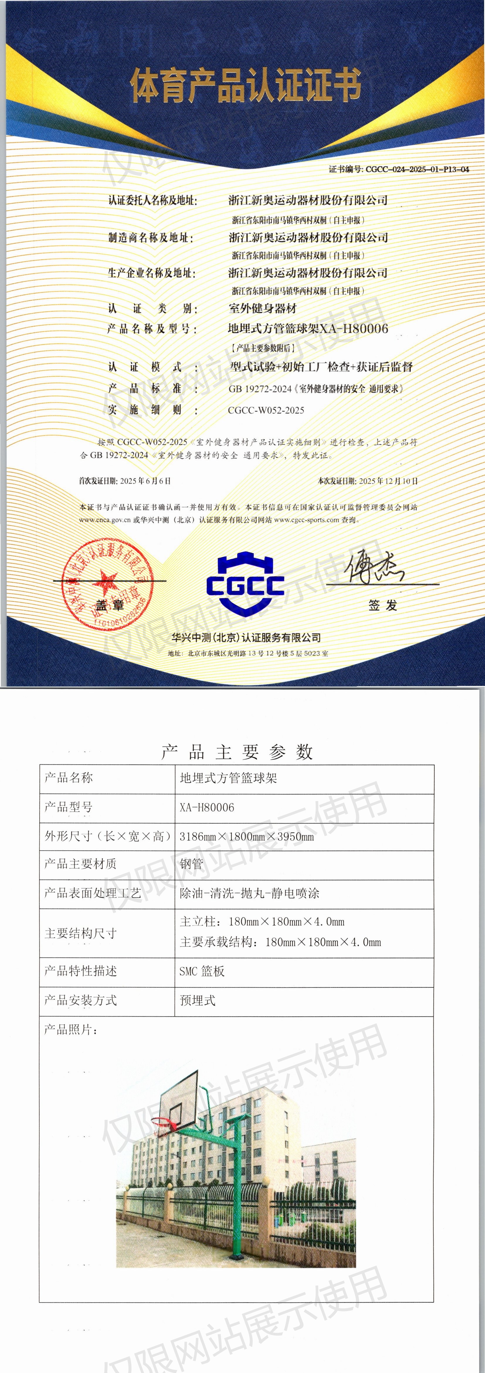 | 6 | 浙江新奥运动器材股份有限公司 | CGCC-024-2025-01-P13-04 | 地埋式方管篮球架 | XA-H80006 | 浙江省东阳市南马镇华西村双桐(自主申报) | GB 19272-2024 | 2025-06-06 | 有效 | 查看 |
