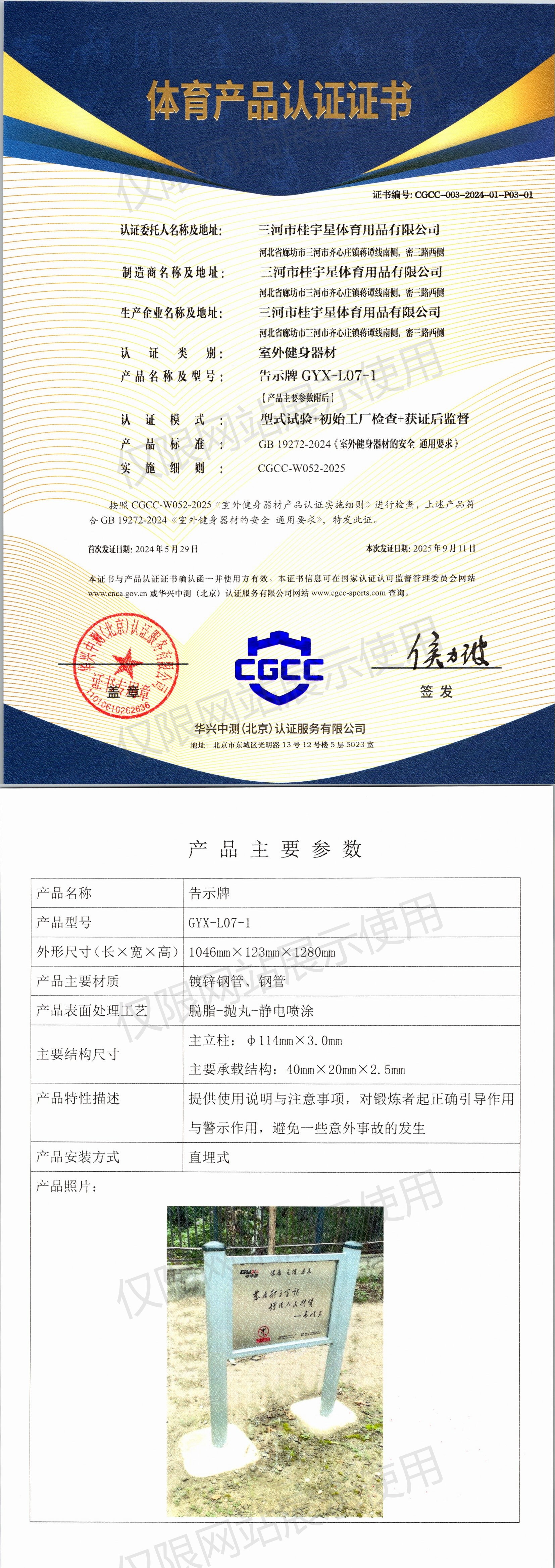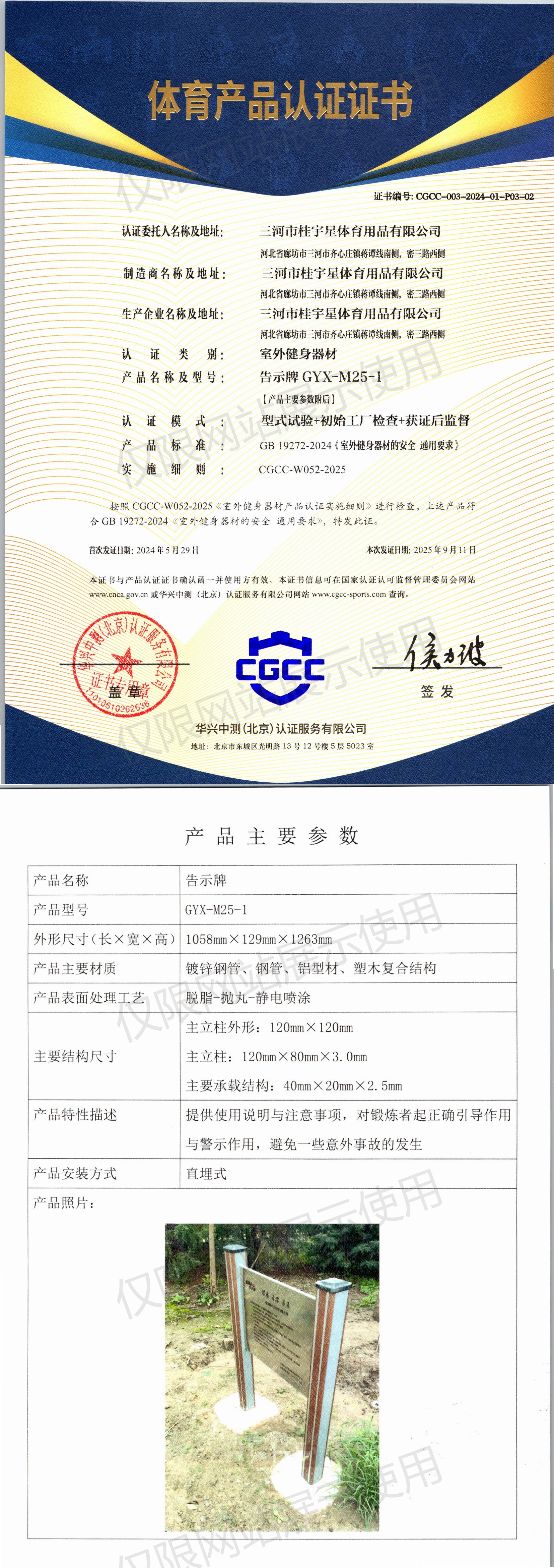 | 3 | 三河市桂宇星体育用品有限公司 | CGCC-003-2024-01-P03-02 | 告示牌 | GYX-M25-1 | 河北省廊坊市三河市齐心庄镇蒋谭线南侧,密三路西侧 | GB 19272-2024 | 2024-05-29 | 有效 | 查看 |
