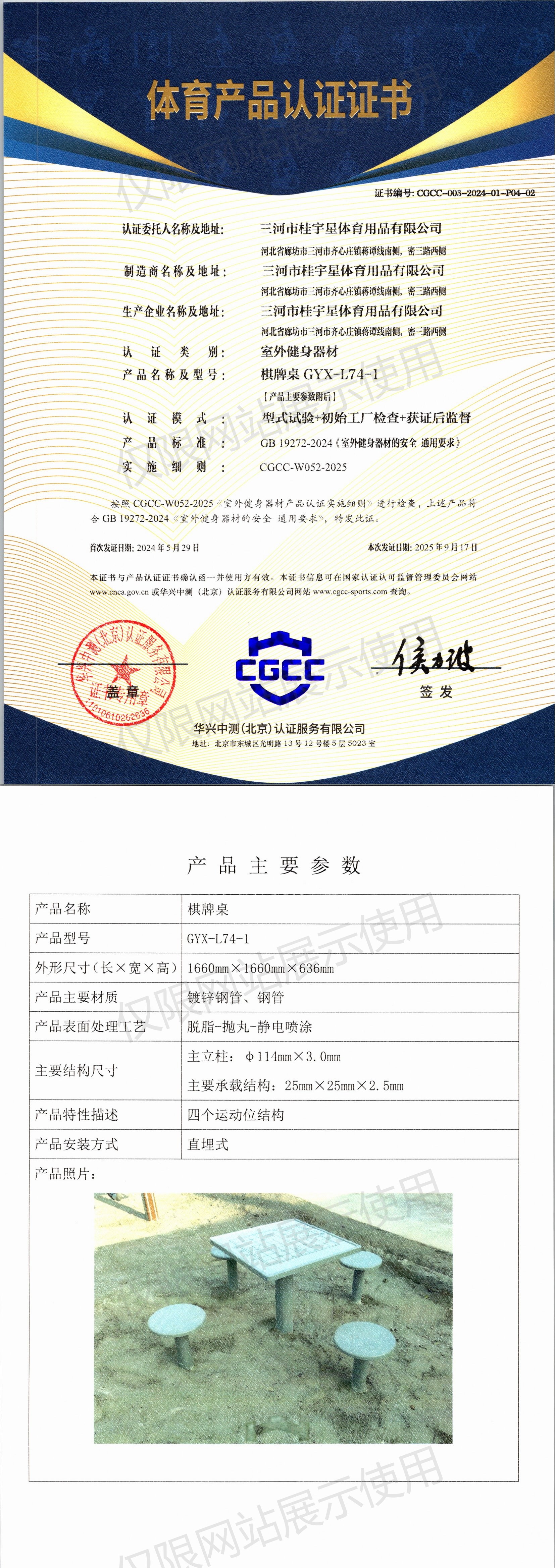 | 8 | 三河市桂宇星体育用品有限公司 | CGCC-003-2024-01-P04-02 | 棋牌桌 | GYX-L74-1 | 河北省廊坊市三河市齐心庄镇蒋谭线南侧,密三路西侧 | GB 19272-2024 | 2024-05-29 | 有效 | 查看 |